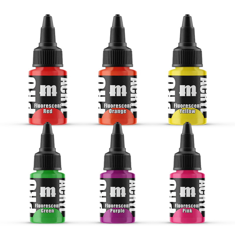 Pro Acryl Fluorescents are Here! Our same, great paint formula, but now in the most vibrant and over-the-top colors for use in all your lighting effects, glowy bits, and synthwave color schemes! These colors will do it all and more. Perfect for creating bright spots of interest on your models and scenics to add just the right touch of POP to draw the eye in.