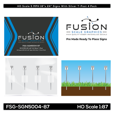Home Fusion Scale Hobbies Online Hobby Shop HO Scale 5 MPH 18"x 24" Signs With Silver T-Post 4 Pack