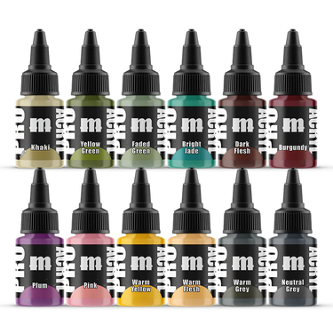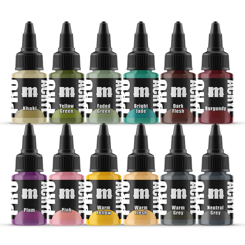 The newest expansion to our Pro Acryl paint line! This set includes 12 new colors with the same, amazing Pro Acryl quality. 22ml bottles Colors include - Yellow Green, Faded Green, Bright Jade, Dark Flesh, Burgundy, Plum, Pink, Warm Yellow, Warm Flesh, Khaki, Warm Grey, and Neutral Grey.