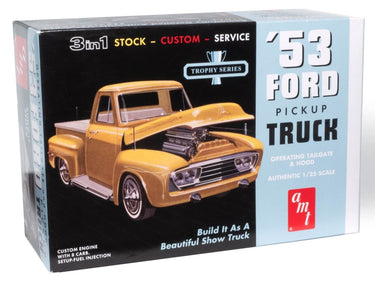 The Kats at AMT have done it again, this time with the Trophy Series 1953 Ford Pickup! It's been BACKDATED TO ITS ORIGINAL 3 IN 1, FIRST ISSUE FORMAT, complete with retro custom wheels, two motors and a wealth of parts for any builder to create a truly unique model!