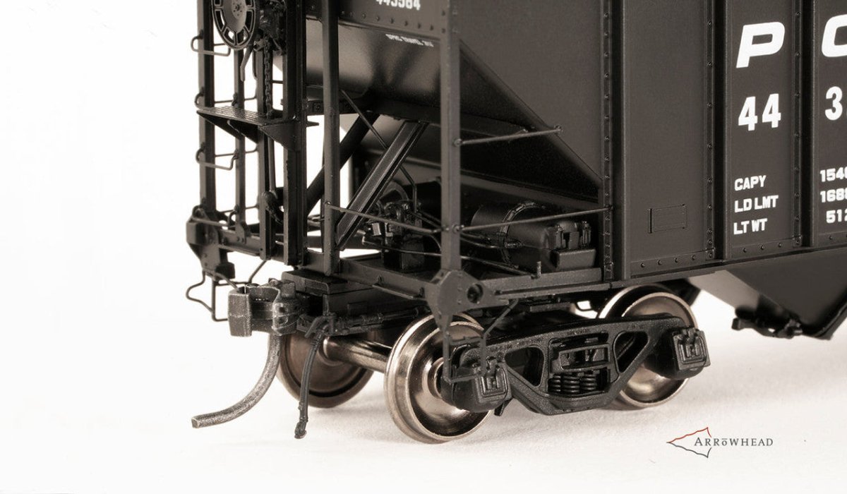 Arrowhead’s Penn Central Committee Design hopper consists of 187 parts per car. It is the most detailed, part intensive open hopper in HO Scale. We have matched the specific details of the Pullman-Standard built cars, including the obvious details, like: Miner gate appliances, Miner hand brake and brake layout, and less obvious details, like: the combination 1942-design hand brake and 1955-design brake wheel, the unique retaining and release rod configurations, and the Pullman defect card holder.
