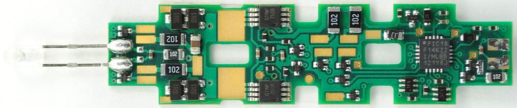 Note: The K0D8 line of decoders are available with different lighting configurations. Pay special attention to the compatibility. The K0D8-B features 1 onboard super-bright, "Sunny White" LED with medium-length leads in the forward direction.