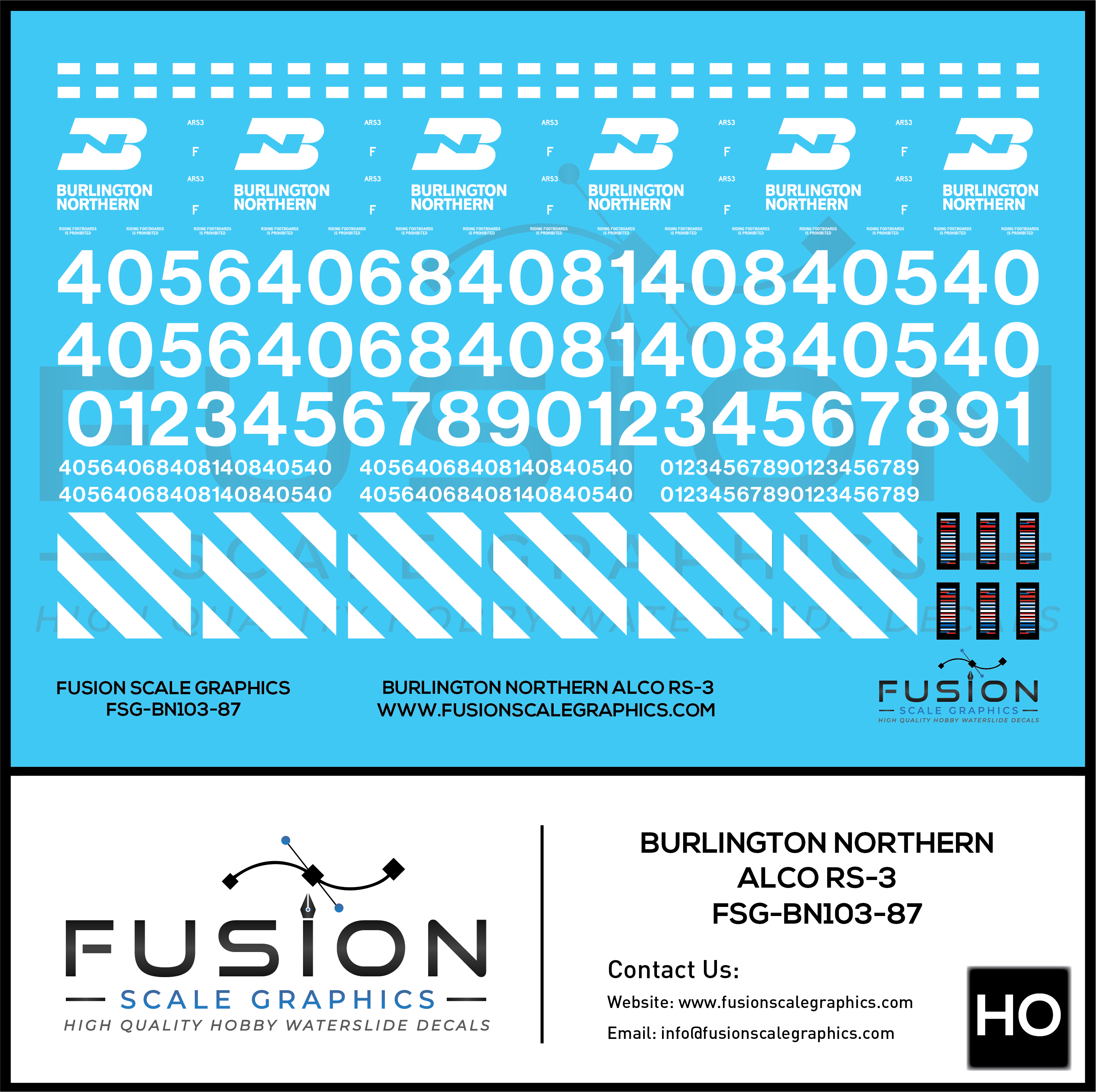 Enhance your hobby with Fusion Scale Graphics' HO Scale Burlington Northern Alco RS-3 Locomotives Decal Set and experience unparalleled realism with every model railroad project.