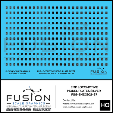 Elevate your model railroad collection with our HO Scale EMD Locomotive Model Decal Set. Featuring a variety of finely detailed black and silver plates, our in-house dry silver ink technology delivers ultra-crisp 2400x4800 dpi prints for a truly luxurious addition to your models. Enhance your layout with these must-have decals.