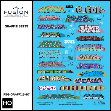 Graffiti decals work great on your freight cars, buildings and many other items across your layout. Our top of the line graffiti decals are printed with a white backing on a clear decal film, this white backing allows the decal to be placed over dark colors (including black). With the ability to print and control where white is printed our decals are not printed on a white decal film.
