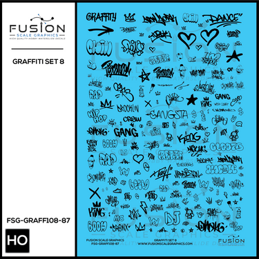 Graffiti decals work great on your freight cars, buildings and many other items across your layout. Our top of the line graffiti decals are printed with a white backing on a clear decal film, this white backing allows the decal to be placed over dark colors (including black). With the ability to print and control where white is printed our decals are not printed on a white decal film.