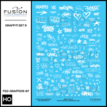 Graffiti decals work great on your freight cars, buildings and many other items across your layout. Our top of the line graffiti decals are printed with a white backing on a clear decal film, this white backing allows the decal to be placed over dark colors (including black). With the ability to print and control where white is printed our decals are not printed on a white decal film.