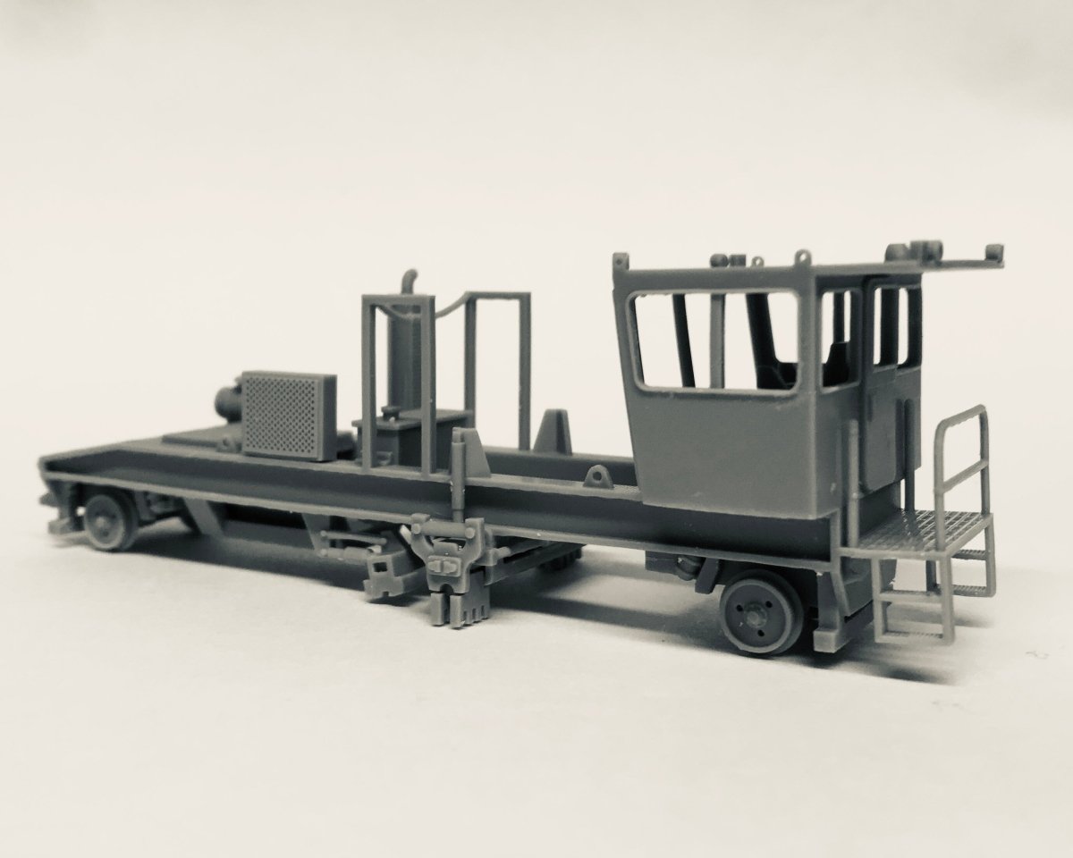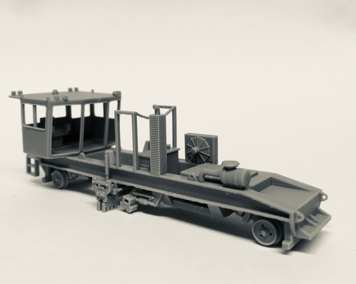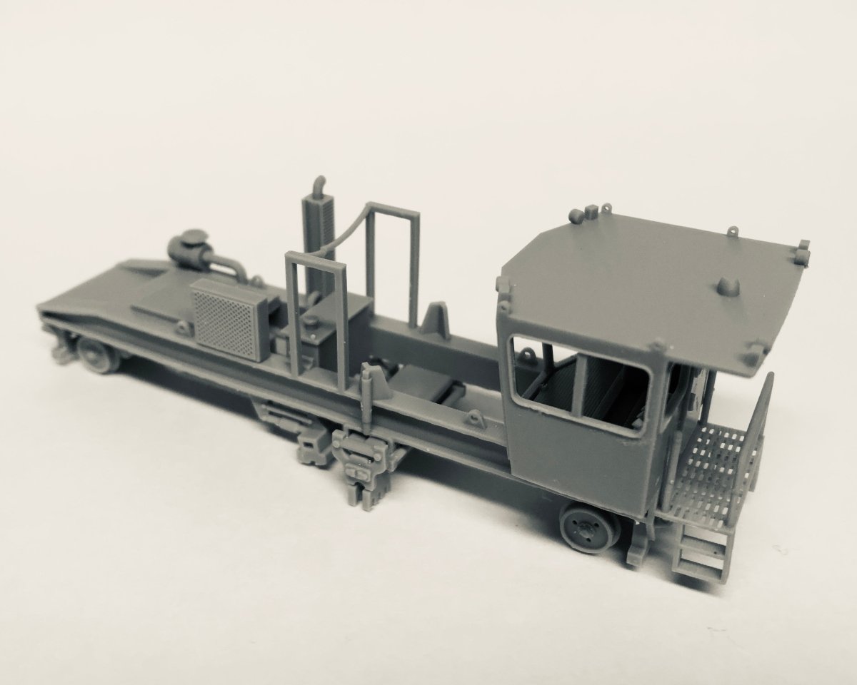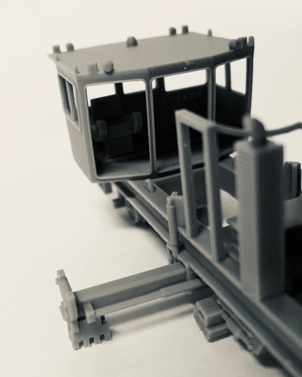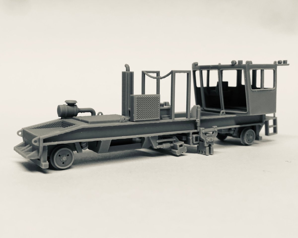 3D printed resin kit, includes main frame with see through deck detail, separate operator seat for positioning over left or right rail, engine housing, cab, wheels, and separate details.