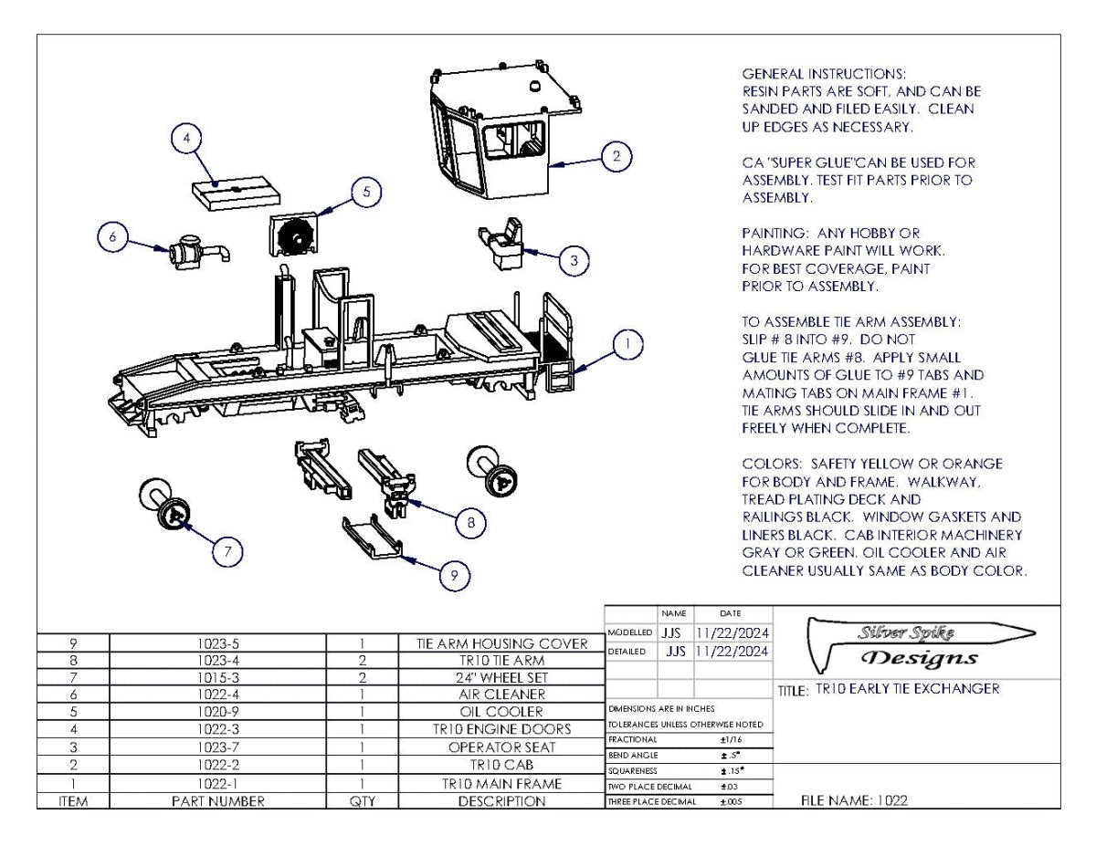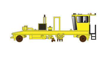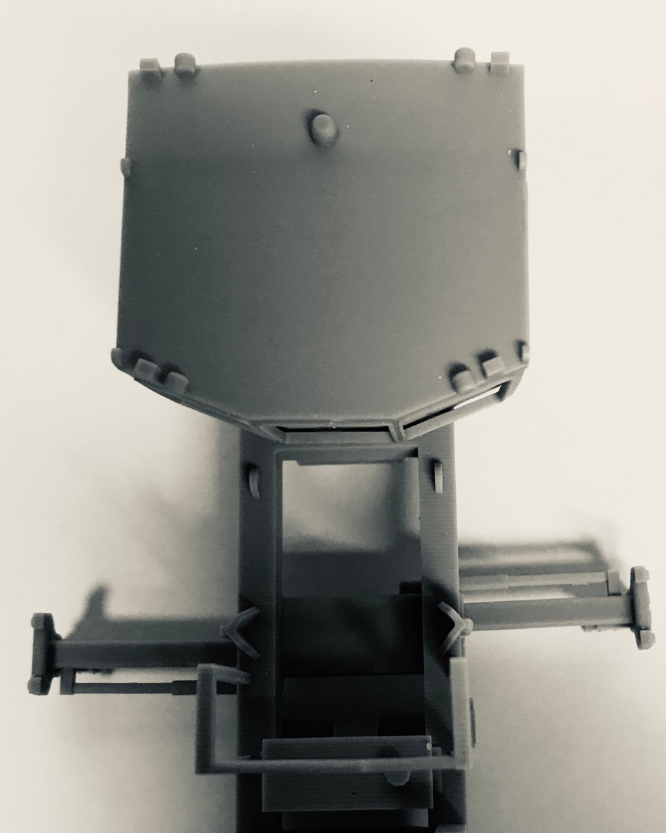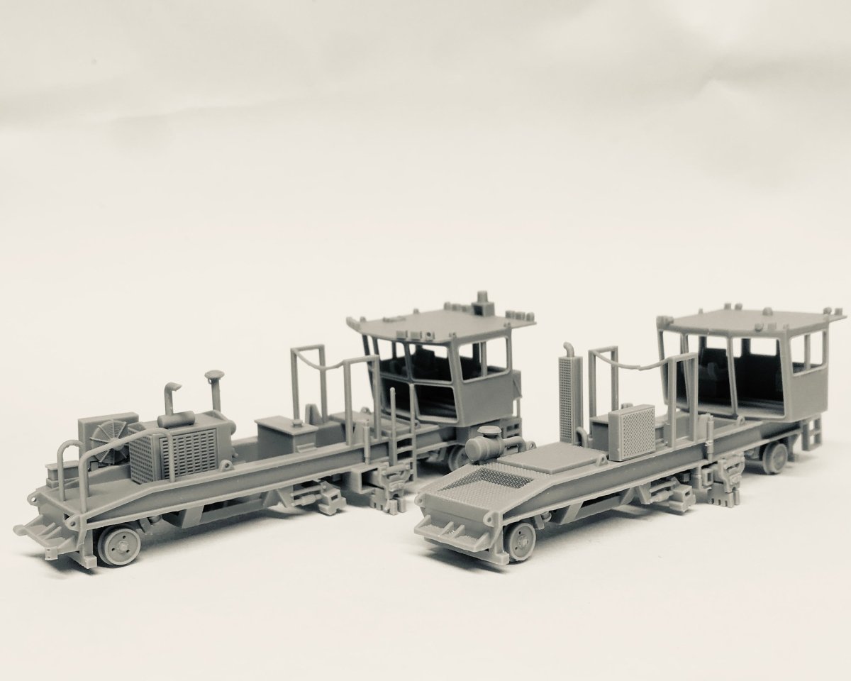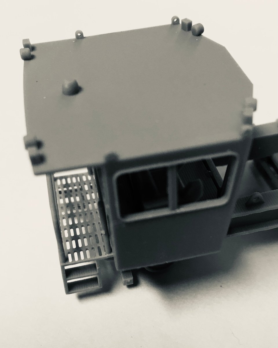 3D printed resin kit, includes main frame with see through deck detail, separate operator seat for positioning over left or right rail, engine housing, cab, wheels, and separate details.