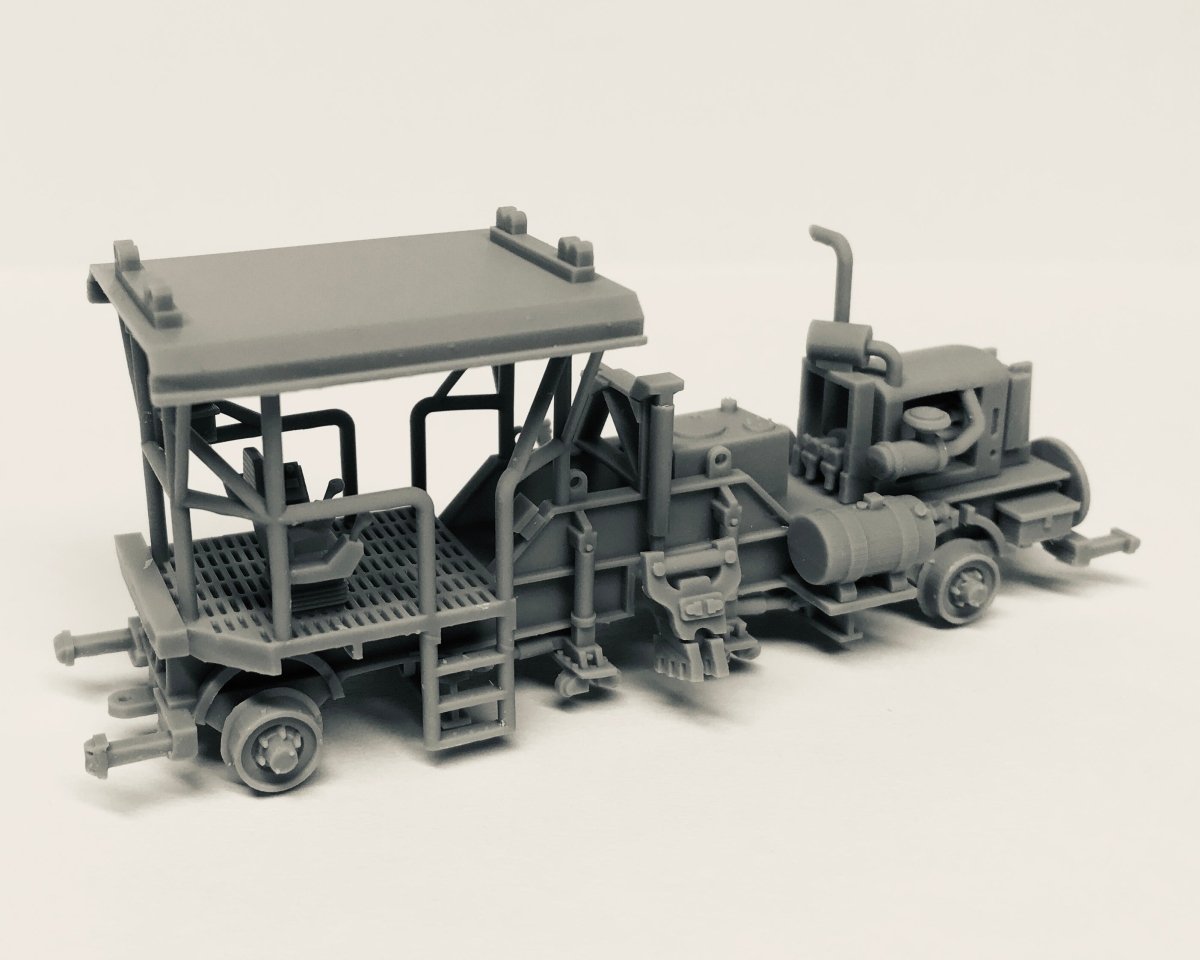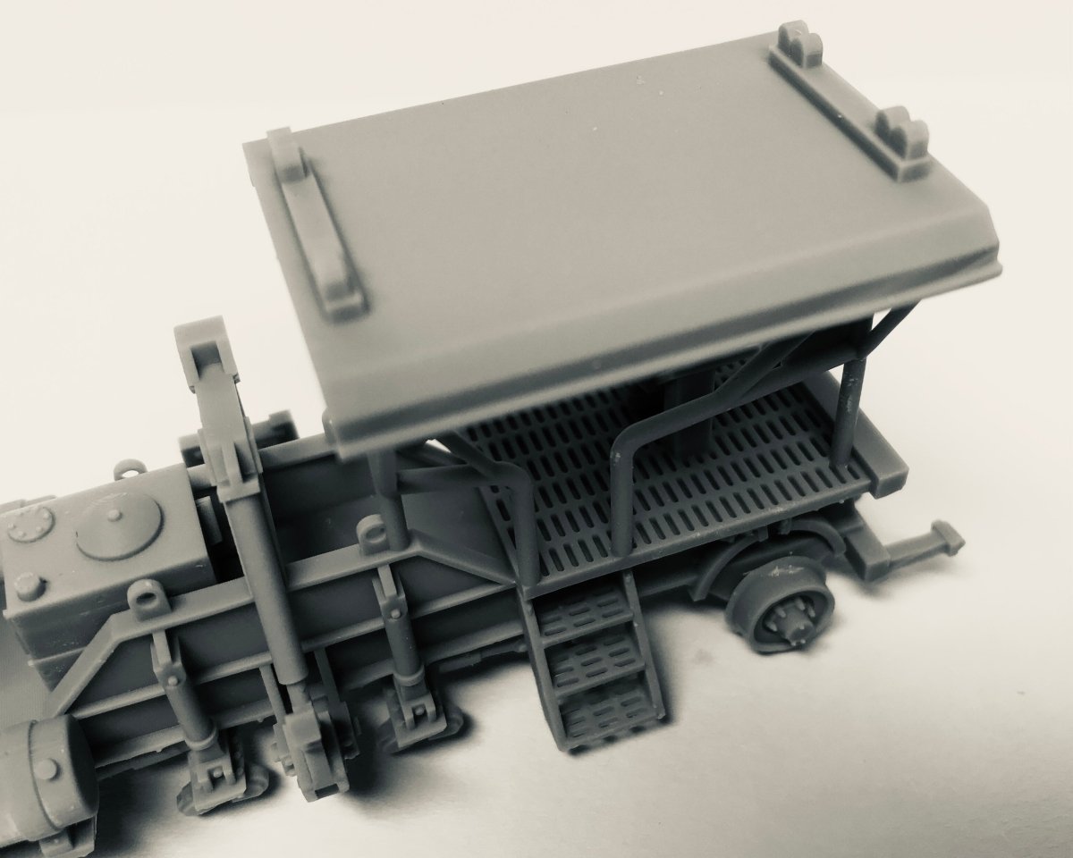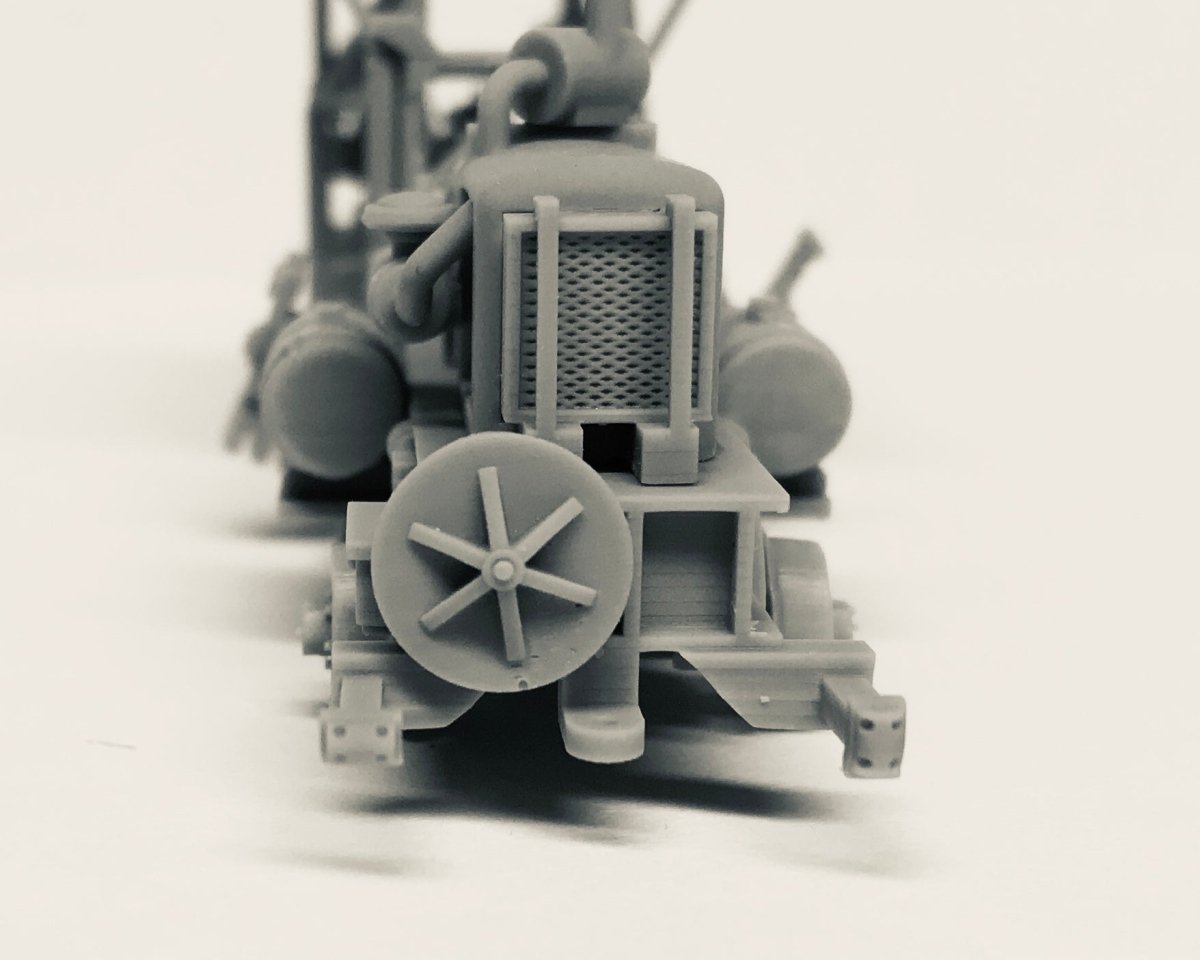 3D printed resin kit, includes main frame with deck detail, round hood engine housing assembly, wheels, and tanks.