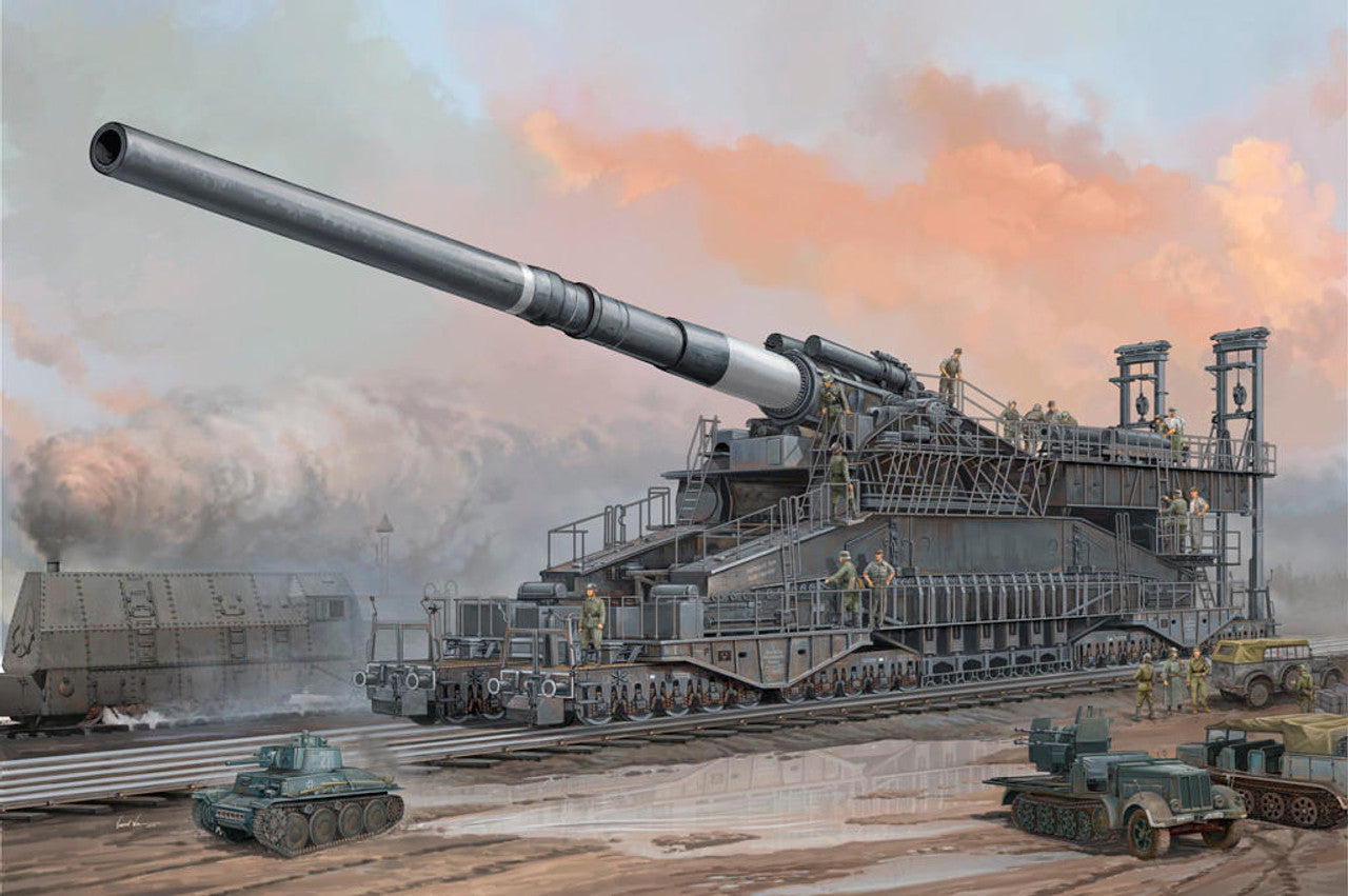 Schwerer Gustav (English: Heavy Gustaf, or Great Gustaf) and Dora were the names of two massive World War 2 German 80 cm K (E) railway siege guns. They were developed in the late 1934 by Krupp for the express purpose of destroying heavy fortifications, specifically those in the French Maginot Line. They weighed nearly 1,350 tonnes, and could fire shells weighing seven tonnes to a range of 37 kilometers. Designed in preparation for World War II, and intended for use against the deep forts of the Maginot Line, they were not ready for action when the Wehrmacht outflanked the line during the Battle of France. Gustav was used in the Soviet Union at the siege of Sevastopol during Operation Barbarossa. They were moved to Leningrad, and may have been intended for Warsaw. Gustav was captured by US troops and cut up, whilst Dora was destroyed near the end of the war to avoid capture by the Red Army.