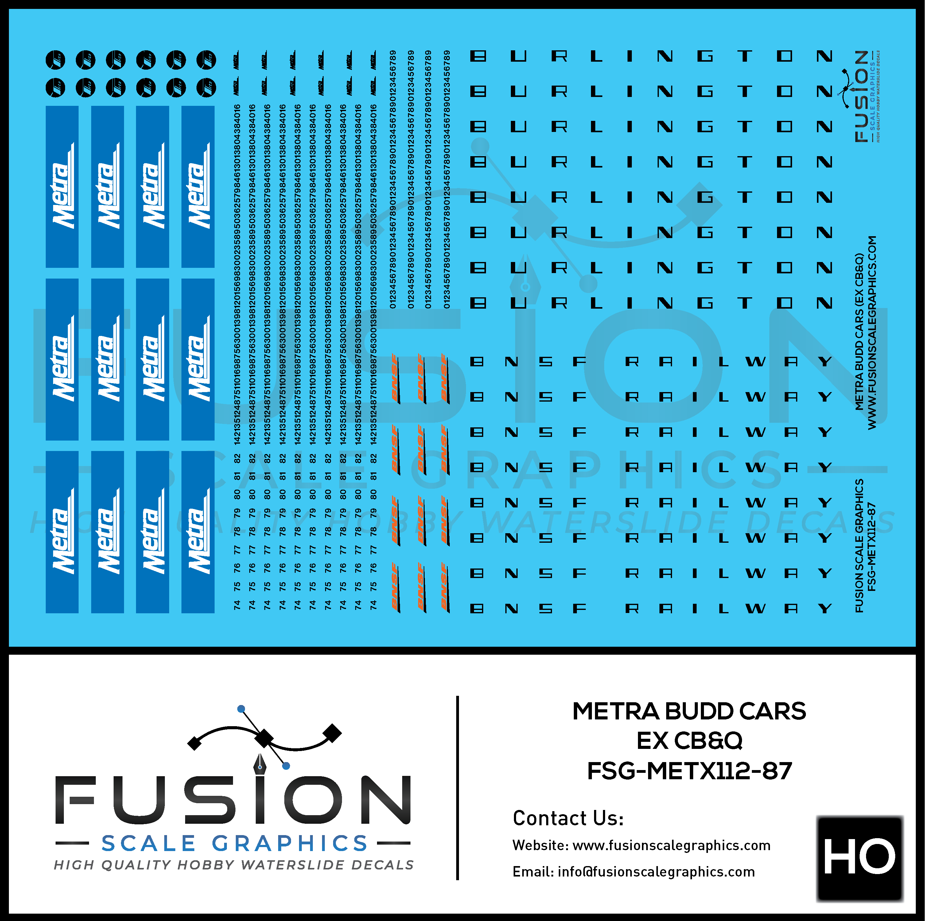 This set is intended to decal the Metra Budd cars from the Burlington. If you are looking to decal the Metra "large window cars" Nippon or the Rock Island/RTA/ MILW Budd cars please see our other Metra passenger car decals.