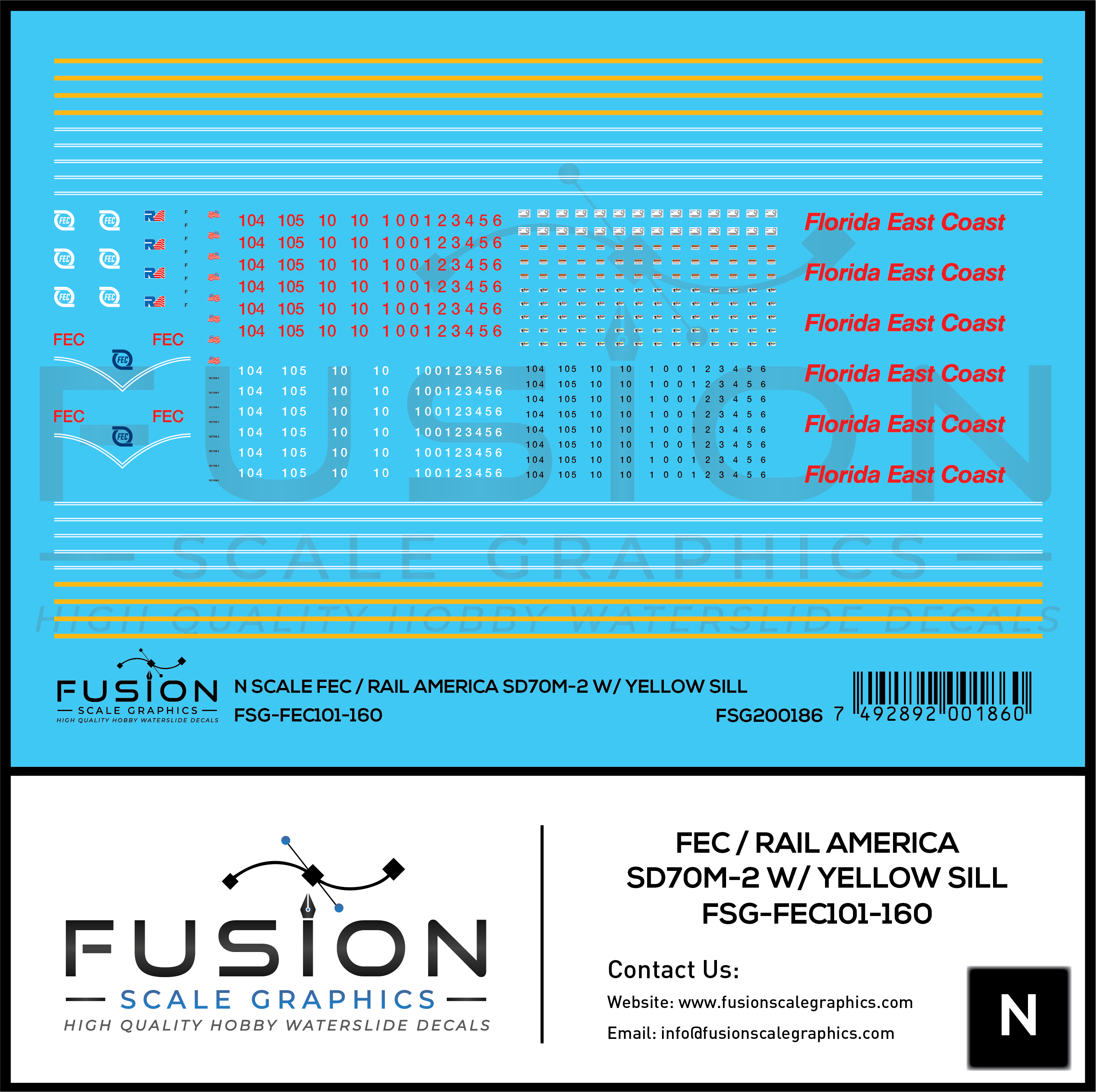 N Scale Florida East Coast/Rail America EMD SD70M-2 W/ Yellow Sill Locomotive Decal Set