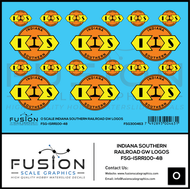 Indiana Southern Railroad logos for the Genesee & Wyoming version of the railroad. Logos will fit GP and SD style locomotives. Pair with our Genesee & Wyoming stripes, numbers and more to complete your fleet. These logos can also be used around the layout for various buildings, cars and more.