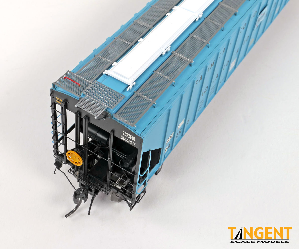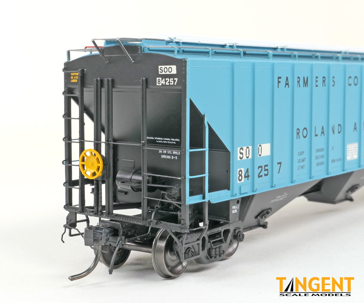 – SOO “Ex-Roland and Nevada IA” 1985+ shows us an example of a 1980s secondhand car, as SOO Line expanded their grain fleet. These cars aren’t like the patches you see in the 2000s+, with lots of paint changes and added lettering. “SOO” was carefully patched over the PTLX and the first digit of the former Pullman lease series. Simple and understated, just like 1980s patches should be. This SOO leaser features a more weathered blue body color and a weathered and peeling “RN” logo panel in the middle of the car, matching its prototype photo. The roof walkways finished with a weathered “unpainted” metal look, to mimic the real car. The other details are accurate for this former PTLX leaser, including a Pullman body with open-hole posts, center-tube train air line, and truck mounted brake hardware. (Notice there is no brake cylinder on the B-End!) The bays are equipped with beautifully replicated early-style Miner outlet gates. The model comes equipped our 100-ton Barber S-2 trucks with accurate “Timken” rotating caps and correct truck-mounted brake beams. The model even has its former PTLX reporting mark printed on the draft gear!