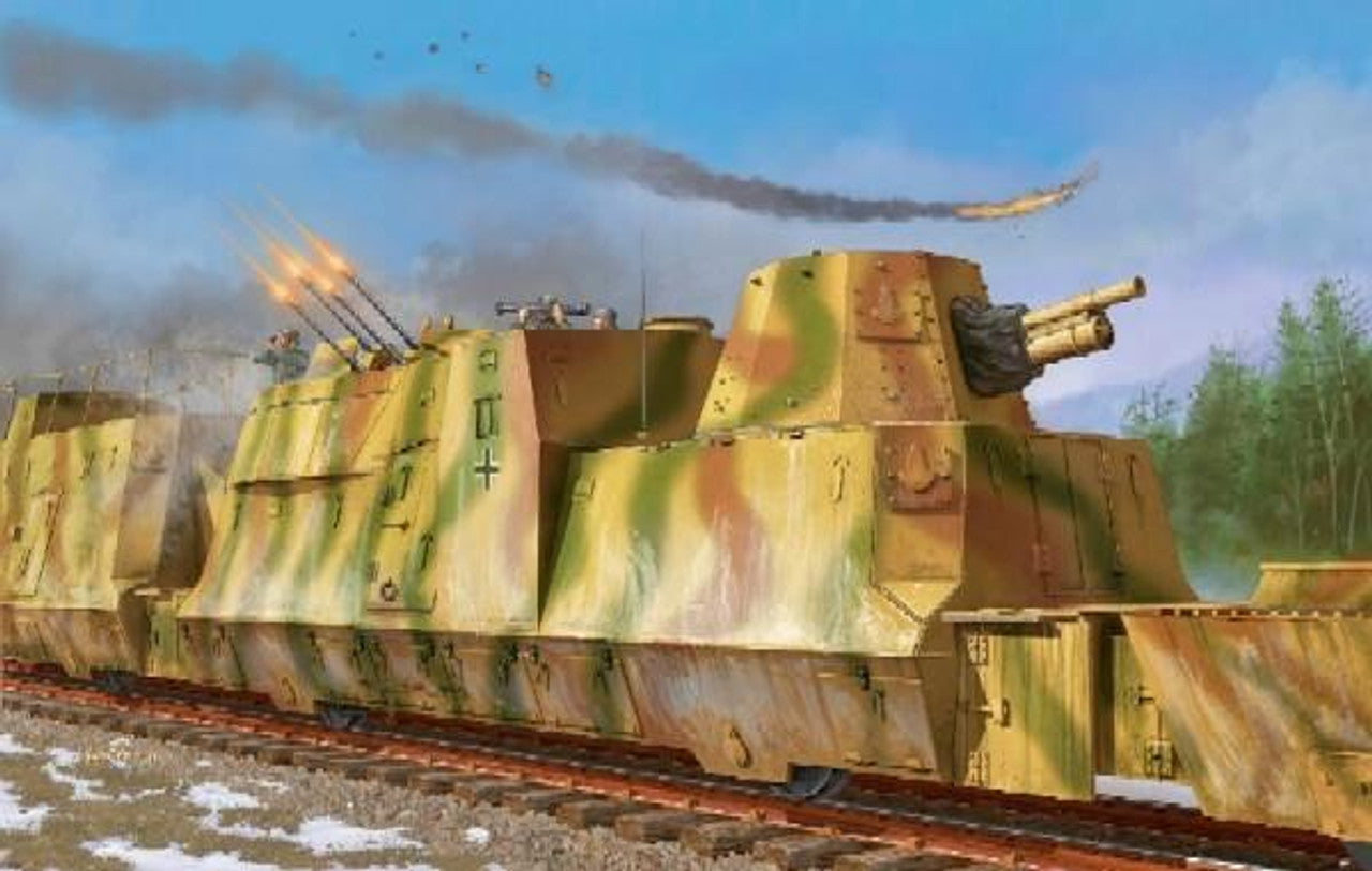 For the armored train units of Type BP42, the artillery was increased, following Russian and Polish examples, to four guns, which were not, though ,mounted two to a car as in the latter types, but one per separately built ten-sided rotating turret, in order to avoid too-great losses from a direct hit. The two halves of the train, before and behind the locomotive were identical and consisted of one artillery car with one 10cm le.F.H 14/19(p) gun, one command and infantry car and one artillery and anti-aircraft car with one 7.62cm F.K.295/l(r) and one 2-cm anti-aircraft quadruple unit.