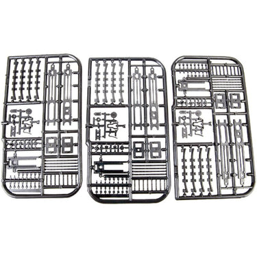 Set includes three switch stands, 24 rail bolts bars, 42 rail braces, 12 frog bolt bars, six Code 70 guardrails, six Code 83 guardrails, six CVT throw bars, six CVT Point retainers plates and three CVT head tie blocks. Central Valley Modelworks HO Scale Switch Detail Parts