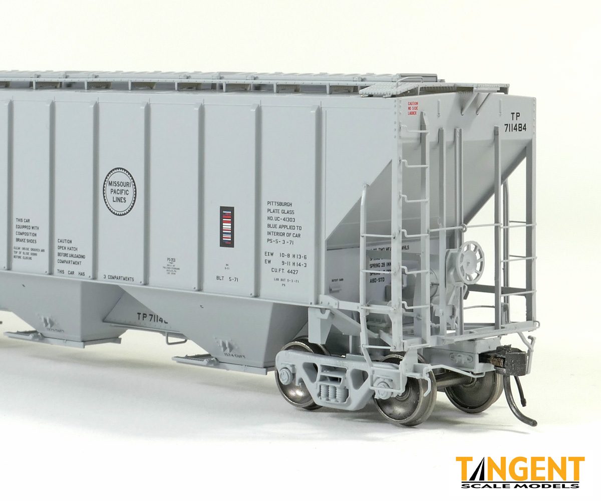 – Texas & Pacific TP “Delivery Gray 5-1971” replicates the as-delivered gray of a huge TP order for 500 cars.  The prototype cars are late Pullman-Standard 4427 production, so that means they have the 2-step corner stirrups, jacking pads above the trucks and no center sill supports between the bays.  These features have been carefully executed on the model.  The models are equipped with accurate Keystone Portloc gravity outlet gates along with an Apex running board and end crossover platforms.  The TP lettering follows the MP graphics style of the era.  TP/MP lettering is distinctive in its “look” and deserves this careful attention in HO.  Equipped with gray 100-ton Barber S-2 trucks with body-mounted brake beams and rotating Hyatt caps, these TP covered hoppers are sharp.