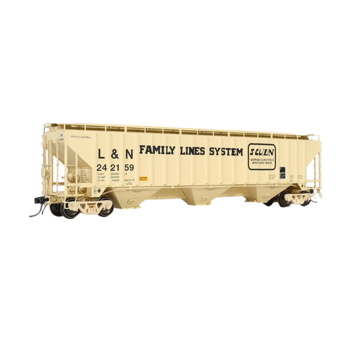 LN Family Lines “Original 12-1980” is an exciting offering for us, championed by Family Lines and CSX modelers alike. Built in 1980, the L&N cars have those distinctive wider jacking tabs associated with much (but not all!) of Pullman’s late production. The center sill correctly models the brake linkage “access holes” on one side of the car, just like the real ones. Notice the side posts – they are the proper “closed hole” style at the bottom. This matches the L&N order exactly. Our 100-ton Barber S-2 trucks are beige to match the body paint. This is a big scheme, and we know the Family Lines modelers have been very patient.