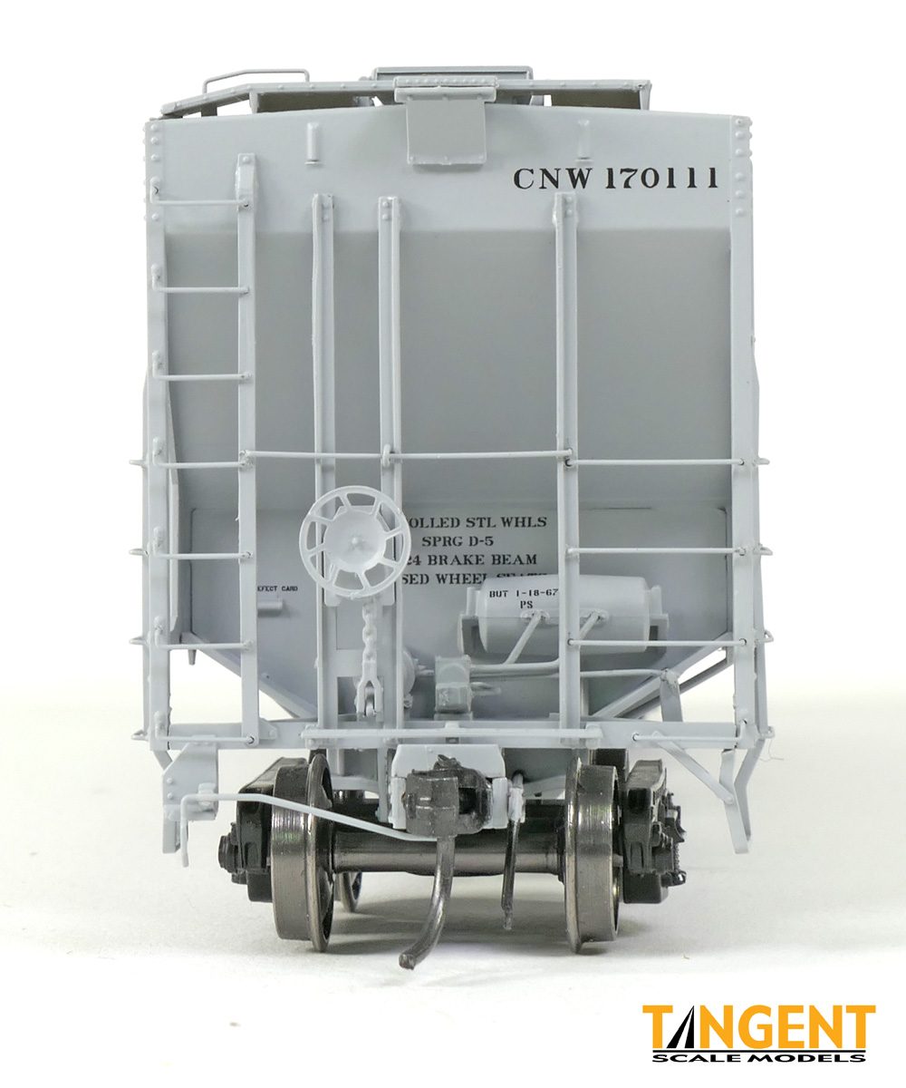 – Chicago and North Western C&NW “Delivery 1-1967” wears the light gray paint and black graphics scheme as applied to the entire 500-car C&NW order from Pullman-Standard.  The C&NW lettering has been carefully replicated, from the ball-and-bar logo to the tiniest PS lot 9181 stencil number.  All of the lettering is present and accurate.  We even found an example from this class still in original paint in 2005!  These cars feature Miner gravity gates and a PS ribbed-style roof hatch.  Check out that accurate Universal brake wheel on the end!  The model also features 100-ton Barber S-2 trucks with rotating Timken caps