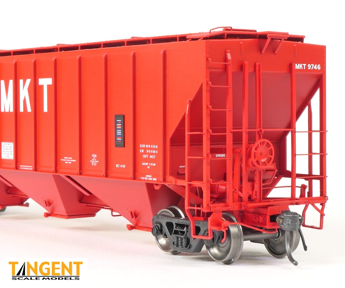 – Missouri-Kansas-Texas MKT “Delivery Red 4-1968 replicates the as-delivered red paint of the MKT. Pullman-Standard delivered 300 cars to the Katy in 1968. The models are equipped with original Miner outlet gates along with an Apex running board and end crossover platforms. The carbody features bold MKT graphics along with all that accurate Pullman-Standard data. If you look closely at the ACI label, you will notice that it is mounted on a larger plate, raised from the car side. We have carefully duplicated this little detail. Equipped with 100-ton Barber S-2 trucks with truck-mounted brake beams and rotating Brenco-6 caps, these Katy covered hoppers are hard to beat.