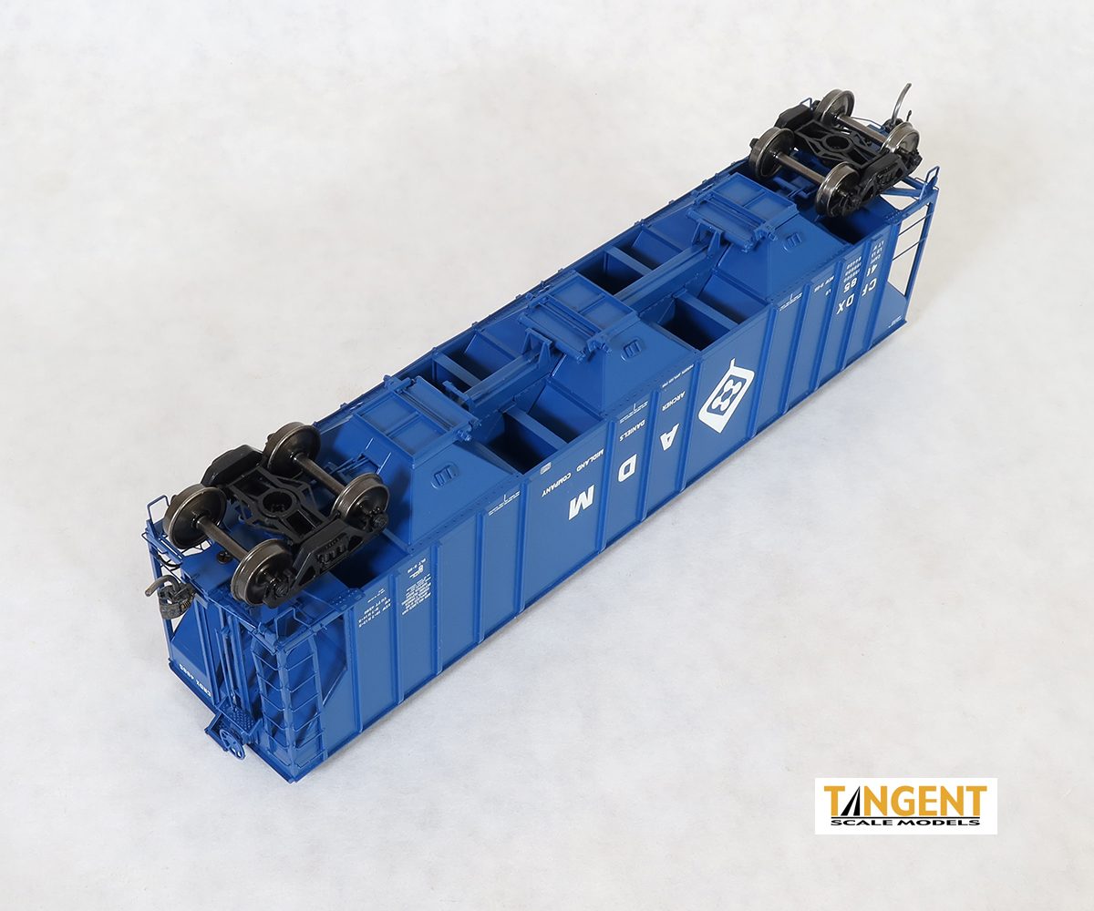 CRDX “ADM Blue Lease 9-1966” is one of those schemes that defines the word “sharp.”  ADM leased these cars from Chicago Freight Car Leasing Company (CRDX) and they were painted in a wonderful ADM dark blue with white graphics.  These models duplicate the CRDX prototypes with Morton roof walkways and body mounted brake gear.  Look closely at the bays, and you will notice the distinctive Wine “Combo” style outlet gates that allowed for either normal gravity unloading or low pressure air-assisted pneumatic unloading depending on the commodity.  The B-end features an accurate Morton brake step and Ajax power brake.  The low retainer valve is mounted near the air reservoir, just like the prototype.  The black 100-ton Barber S-2 trucks have accurate rotating Timken bearing caps