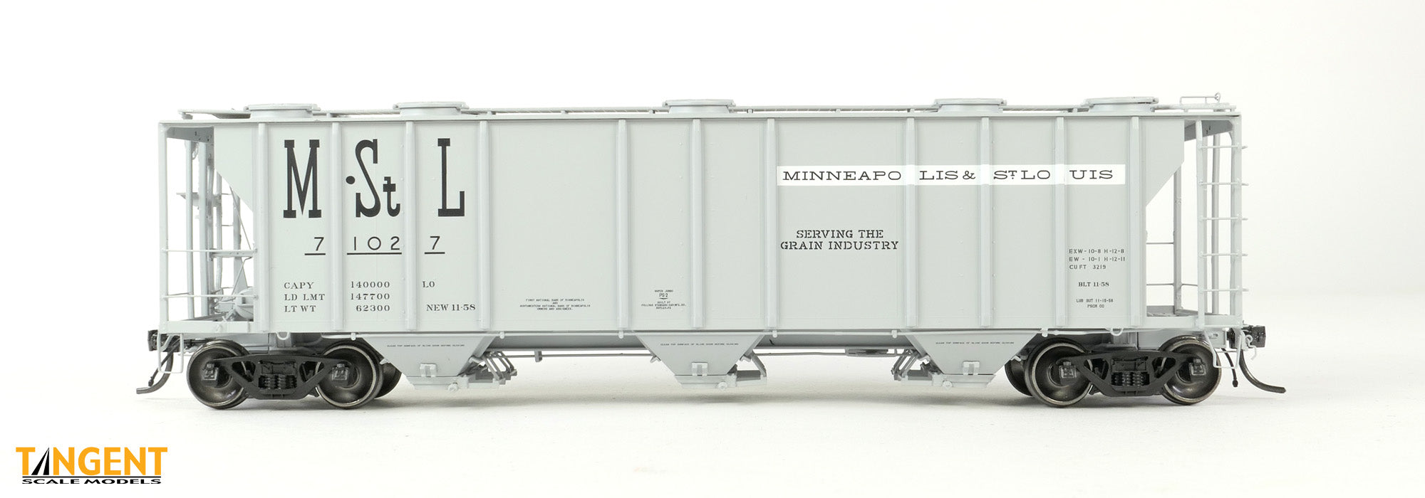 – Minneapolis & St. Louis Railway (M&StL) “Delivery Gray 11-1958” shows us another classic gray painted PS-2 3215.  The M&StL graphics are carefully duplicated on the car, from the memorable M&StL logo, the spelled-out “Minneapolis & St. Louis” lettering inside the white rectangle, and the “Serving the Grain Industry” lettering all in capital letters!  Neat stuff!  These cars were acquired so M&StL could expand away from 40 foot box cars for grain services.  M&StL was a grain- and other commodity hauling railroad that had a primary trunk that served the breadbasket states of South Dakota, Minnesota, Iowa, and Illinois.  These M&StL cars feature Apex-style running board and “Early-style” round roof hatches.  The B-end of the car features all of the brake details and piping of the prototype, including a gorgeous Universal 7400 brake stand, Universal brake wheel, Apex-style brake step, wire piping details and a finely executed Retaining Valve mounted on the end of the carbody.  This M&StL replica rides on the Tangent 70-ton ASF Ride Control Plain Bearing truck.  The three bays are equipped with an earlier style of Enterprise discharge gates, with the support straps attaching to the rear “L” channel.  Metal corner stirrup steps and flexible rubber air hoses on each end of the car provide durability.  These models are available with November 1958 dates.  It isn’t often that you get an M&StL-specific railcar.  Also, this is the first time Tangent has released a railcar in original M&StL paint!
