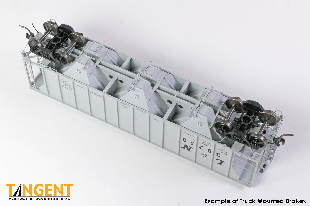 – Louisville & Nashville (L&N) “Delivery Gray 10-1963” shows us the earliest Pullman-delivered PS-2 2929s in original gray paint. The L&N graphics are carefully duplicated on the car, from the slanted “L&N” reporting marks and three-inch “Roman” style capacity data, down to the one-inch Pullman data. These L&N cars differ from the other 2929s that we offer because they have 5 pairs of roof hatches with staggered spacing, as opposed to the “standard” evenly-spaced hatches common to the other 2929s of the era. But don’t worry — we have tooled this L&N-specific roof to execute this model correctly. And if you look closely at the prototype and model photos, you will see we didn’t stop there. The L&N 2929 LOs also feature truck-mounted brake gear. This translates to the B-end missing the brake cylinder (instead there are small brake cylinders on each truck brake beam) and a fine brake air line visible, hanging down from the underframe between the bays (instead of pipe linkage and the automatic slack adjuster). The B-end of the car has more L&N-specific details like a beautiful Klasing 1700 power brake, separate short handle, modern brake wheel, Cobra brake shoe holder and a small brake badge above the defect card holder. This L&N replica rides on 100-ton Barber S-2 trucks with Timken rotating bearing caps and the three bays are equipped with Enterprise discharge gates. Metal corner stirrup steps and flexible rubber air hoses on each end of the car provide durability. These models are available with October 1963-specific paint dates. Commodities carried included feed and cement. It isn’t often that you get an L&N-specific railcar.
