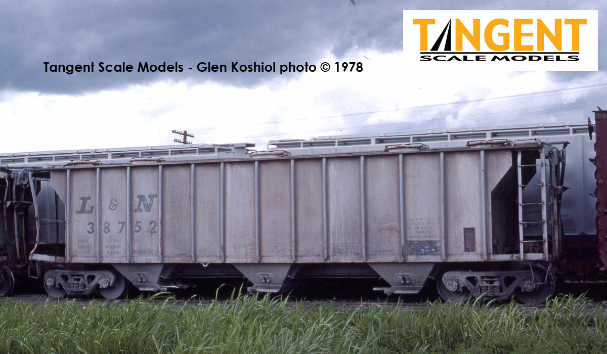 – Louisville & Nashville (L&N) “Delivery Gray 10-1963” shows us the earliest Pullman-delivered PS-2 2929s in original gray paint. The L&N graphics are carefully duplicated on the car, from the slanted “L&N” reporting marks and three-inch “Roman” style capacity data, down to the one-inch Pullman data. These L&N cars differ from the other 2929s that we offer because they have 5 pairs of roof hatches with staggered spacing, as opposed to the “standard” evenly-spaced hatches common to the other 2929s of the era. But don’t worry — we have tooled this L&N-specific roof to execute this model correctly. And if you look closely at the prototype and model photos, you will see we didn’t stop there. The L&N 2929 LOs also feature truck-mounted brake gear. This translates to the B-end missing the brake cylinder (instead there are small brake cylinders on each truck brake beam) and a fine brake air line visible, hanging down from the underframe between the bays (instead of pipe linkage and the automatic slack adjuster). The B-end of the car has more L&N-specific details like a beautiful Klasing 1700 power brake, separate short handle, modern brake wheel, Cobra brake shoe holder and a small brake badge above the defect card holder. This L&N replica rides on 100-ton Barber S-2 trucks with Timken rotating bearing caps and the three bays are equipped with Enterprise discharge gates. Metal corner stirrup steps and flexible rubber air hoses on each end of the car provide durability. These models are available with October 1963-specific paint dates. Commodities carried included feed and cement. It isn’t often that you get an L&N-specific railcar.