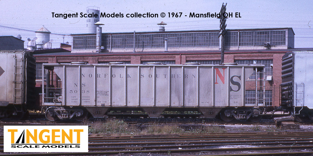 – Norfolk Southern (“Original” NS) “Delivery Gray 1-1966” illustrates the NS order for 100 PS-2 2929cf covered hoppers, delivered in the railroad’s classy Norfolk Southern stenciling, including the large and eye-catching red-painted “N”.  The models feature a see-through Morton-style running board with its distinctive side uni-wing flange, evenly-spaced round roof hatches, body-mounted brake gear and gravity outlet gates.  The B-end of the car features all of the brake details and piping of the prototype, including a gorgeous Ajax brake stand, modern brake wheel, Morton-style brake step, high-mounted retainer valve, wire piping details and a finely executed air release rod poking through the bottom sill on each side of the carbody.  Metal corner stirrup steps and flexible rubber air hoses on each end of the car provide durability.  The model rides on 100-ton Barber S-2 trucks with Timken rotating bearing caps.  We are pleased to offer these classy Norfolk Southern cars from January 1966.  Also, this is the first time Tangent has released a railcar in original Norfolk Southern paint!