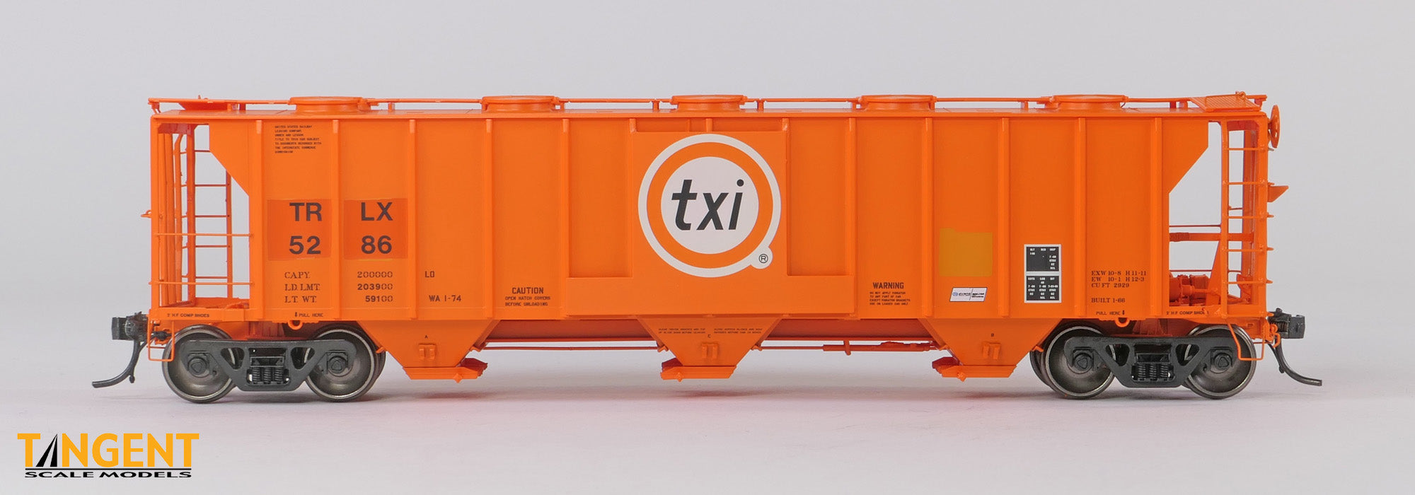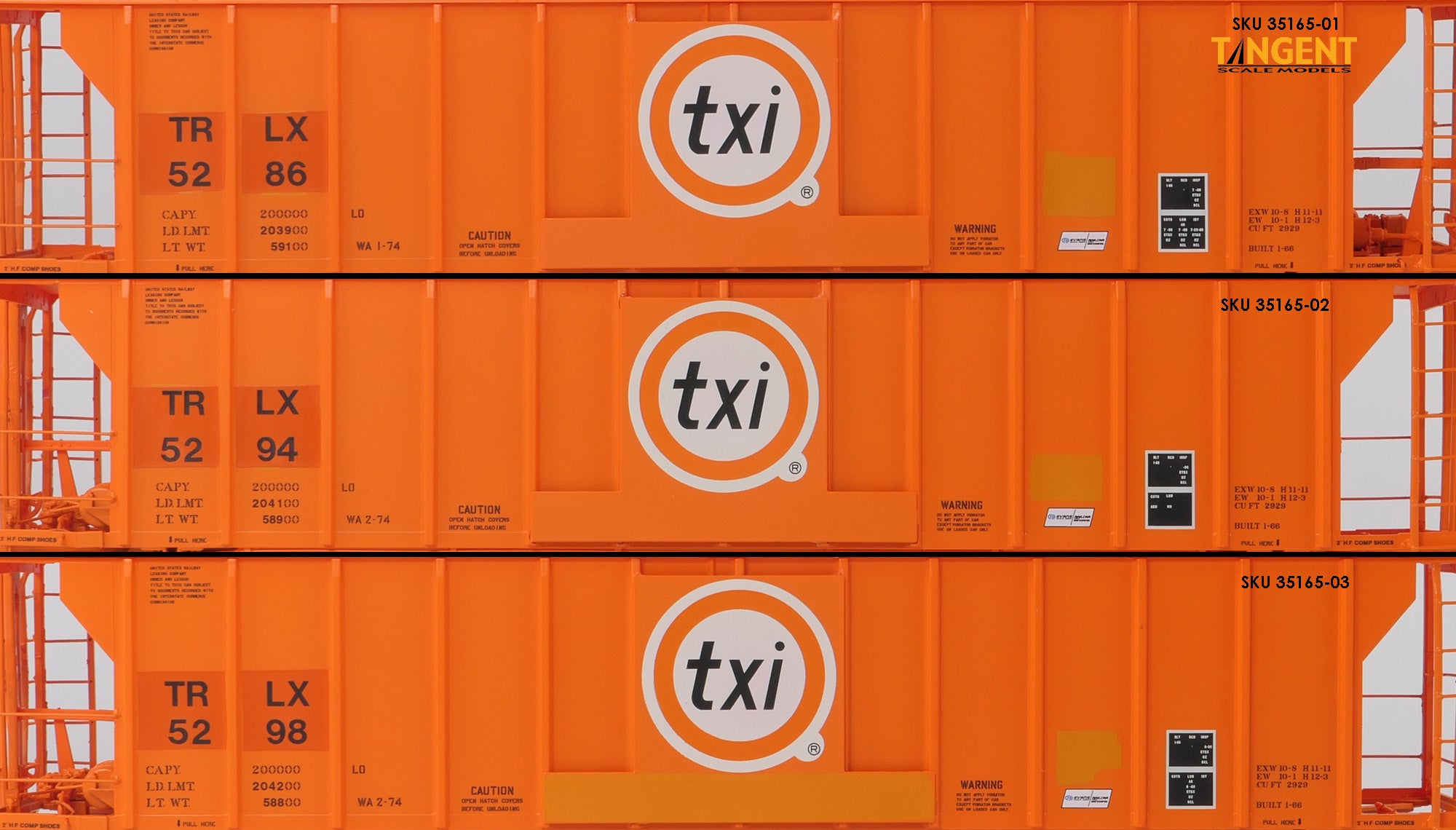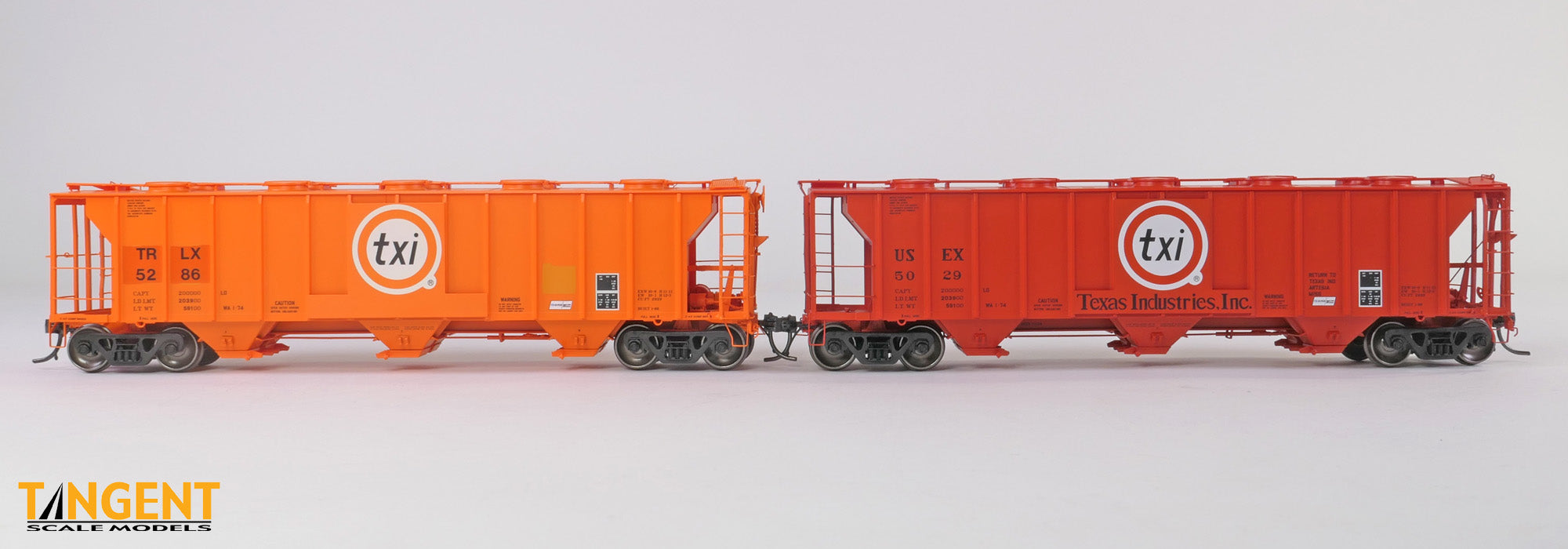 – TRLX “Ex-USRE Texas Industries Restencil 1993+” illustrates a restenciled version of the Texas Industries car we are offering concurrently. These former USRE/Texas Industries Inc. cars were purchased by Texas Railcar Leasing and show their appearance from 1993+ after being restenciled with fresh reporting marks. The Tangent models wear a faded version of the original orange paint, along with fresh patches and stencils for their new owners. Since this group of cars have Norfolk Southern heritage, they feature NS details like a see-through Morton-style running board with its distinctive side uni-wing flange, evenly-spaced round roof hatches, body-mounted brake gear and gravity outlet gates. The B-end of the car features all of the brake details and piping of the prototype, including a gorgeous Ajax brake stand, modern brake wheel, Morton-style brake step, high-mounted retainer valve, wire piping details and a finely executed air release rod poking through the bottom sill on each side of the carbody. Metal corner stirrup steps and flexible rubber air hoses on each end of the car provide durability. The model rides on 100-ton Barber S-2 trucks with Timken rotating bearing caps. We are pleased to offer 3 road numbers in this restencil scheme, providing a neat car option for our 1990s and 2000s customers. Each of the cars is photo-specific with paint-out patches applied based on the photos.