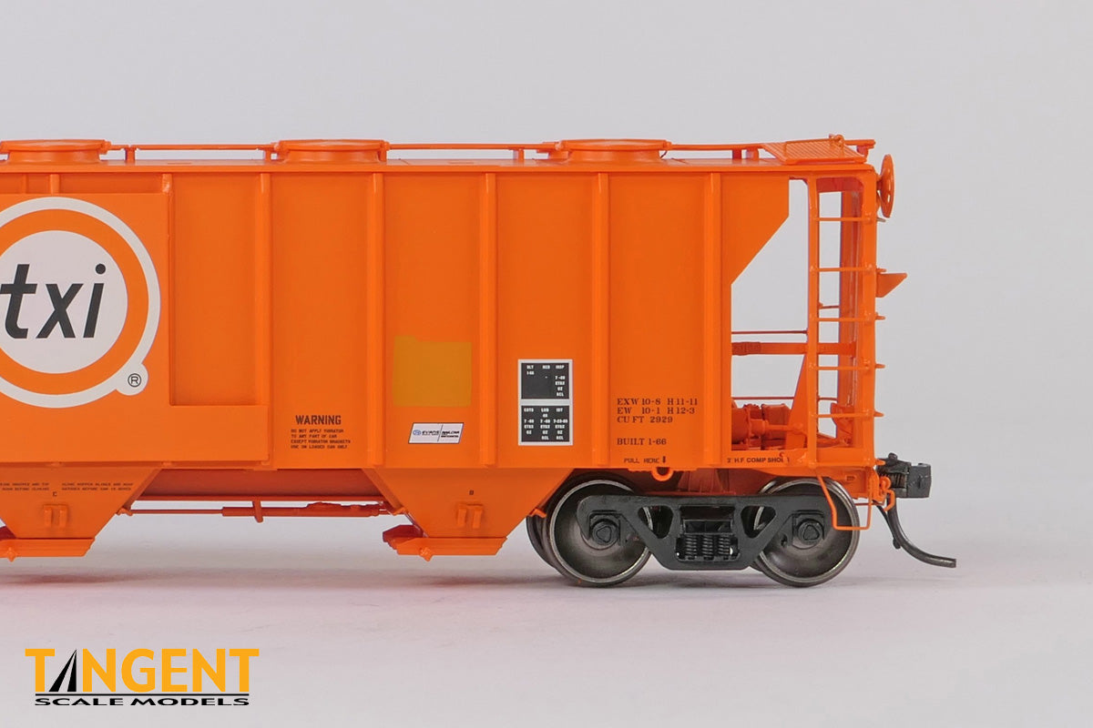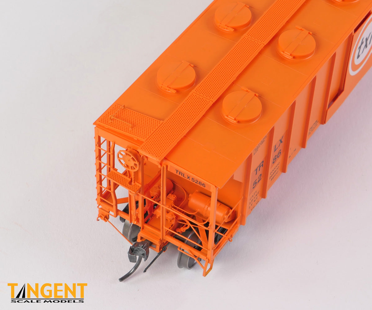 – TRLX “Ex-USRE Texas Industries Restencil 1993+” illustrates a restenciled version of the Texas Industries car we are offering concurrently. These former USRE/Texas Industries Inc. cars were purchased by Texas Railcar Leasing and show their appearance from 1993+ after being restenciled with fresh reporting marks. The Tangent models wear a faded version of the original orange paint, along with fresh patches and stencils for their new owners. Since this group of cars have Norfolk Southern heritage, they feature NS details like a see-through Morton-style running board with its distinctive side uni-wing flange, evenly-spaced round roof hatches, body-mounted brake gear and gravity outlet gates. The B-end of the car features all of the brake details and piping of the prototype, including a gorgeous Ajax brake stand, modern brake wheel, Morton-style brake step, high-mounted retainer valve, wire piping details and a finely executed air release rod poking through the bottom sill on each side of the carbody. Metal corner stirrup steps and flexible rubber air hoses on each end of the car provide durability. The model rides on 100-ton Barber S-2 trucks with Timken rotating bearing caps. We are pleased to offer 3 road numbers in this restencil scheme, providing a neat car option for our 1990s and 2000s customers. Each of the cars is photo-specific with paint-out patches applied based on the photos.