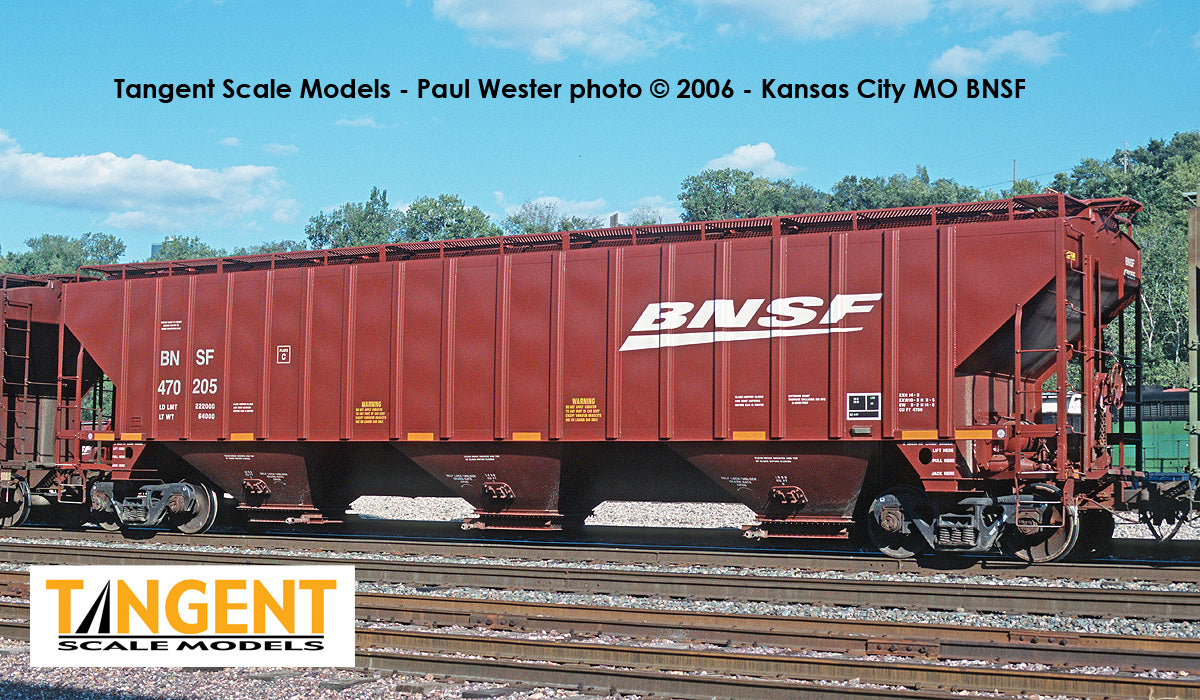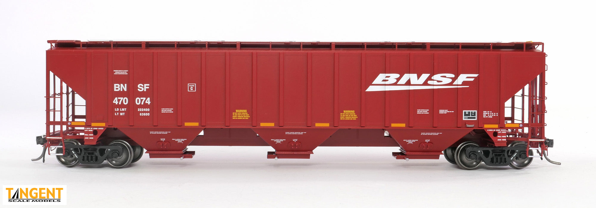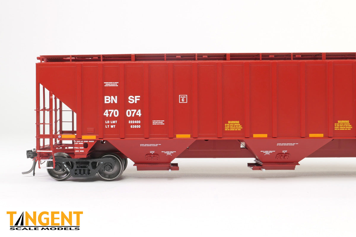 – BNSF “Large Swoosh 2005” complements our BN car offering in this run of Trinity 4750s, for those that model BNSF in the conspicuity era.  This car is a stunner with its BNSF oxide red paint color, the large and bold BNSF swoosh logo on the right side of the carbody, and the conspicuity stripe markings alongside the model.  These cars are former BN Trinity 4750s built in 1994.  These cars have a Phase 4 body and bolster arrangement, including the jacking pad design that is less long horizontally, and with an oval-shaped attachment hole in the center.  Additionally, these cars introduce the “bolt on” outlet gate design that was found on some of the Trinity 4750 prototypes.  Up on the roof of the cars is a carbody red painted galvanized “slope up” Morton-design running board, and the fiberglass trough hatches that BNSF applied are replicated on our model.  The ends of the cars include a body-mount brake system, Universal 9300DC brake housing, tube-style defect card holders, and straight-handle coupler lift bars, all of which are accurately modeled on our Tangent replicas.  Underneath the cars, the centersill dividers have access holes in them like they should, and a “angled style” AEI tag mount.  Don’t miss out, these will go quickly!