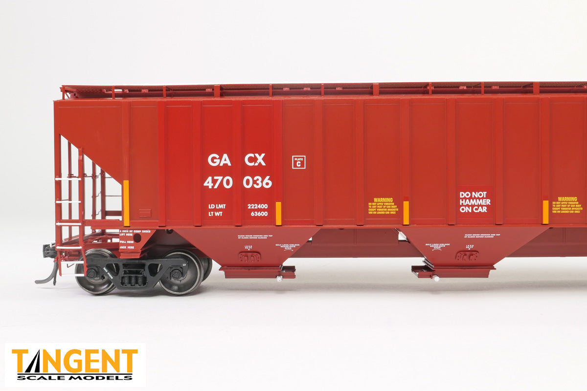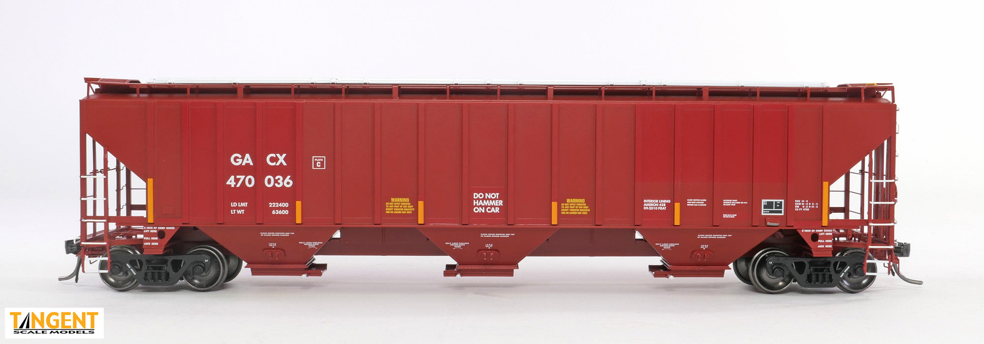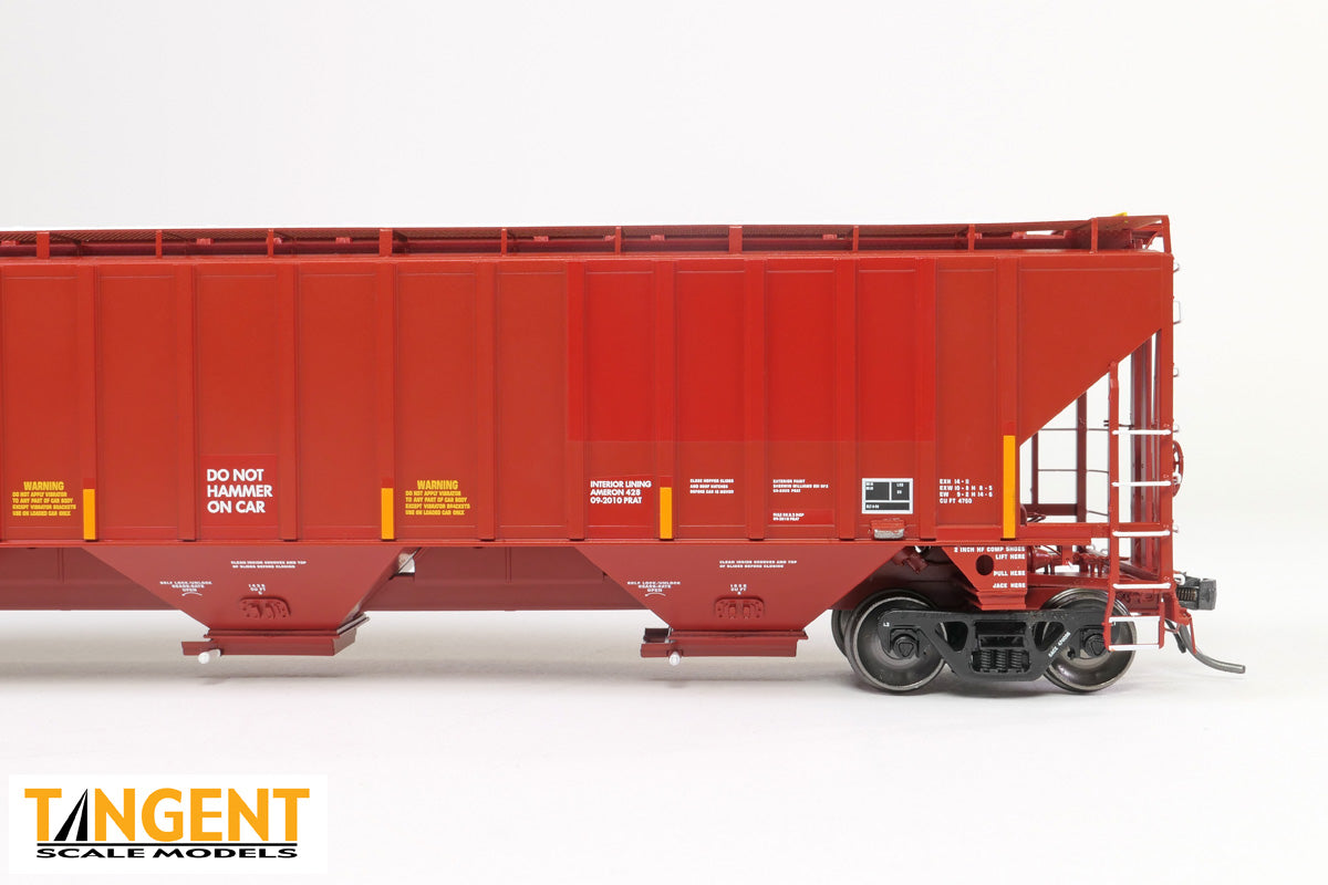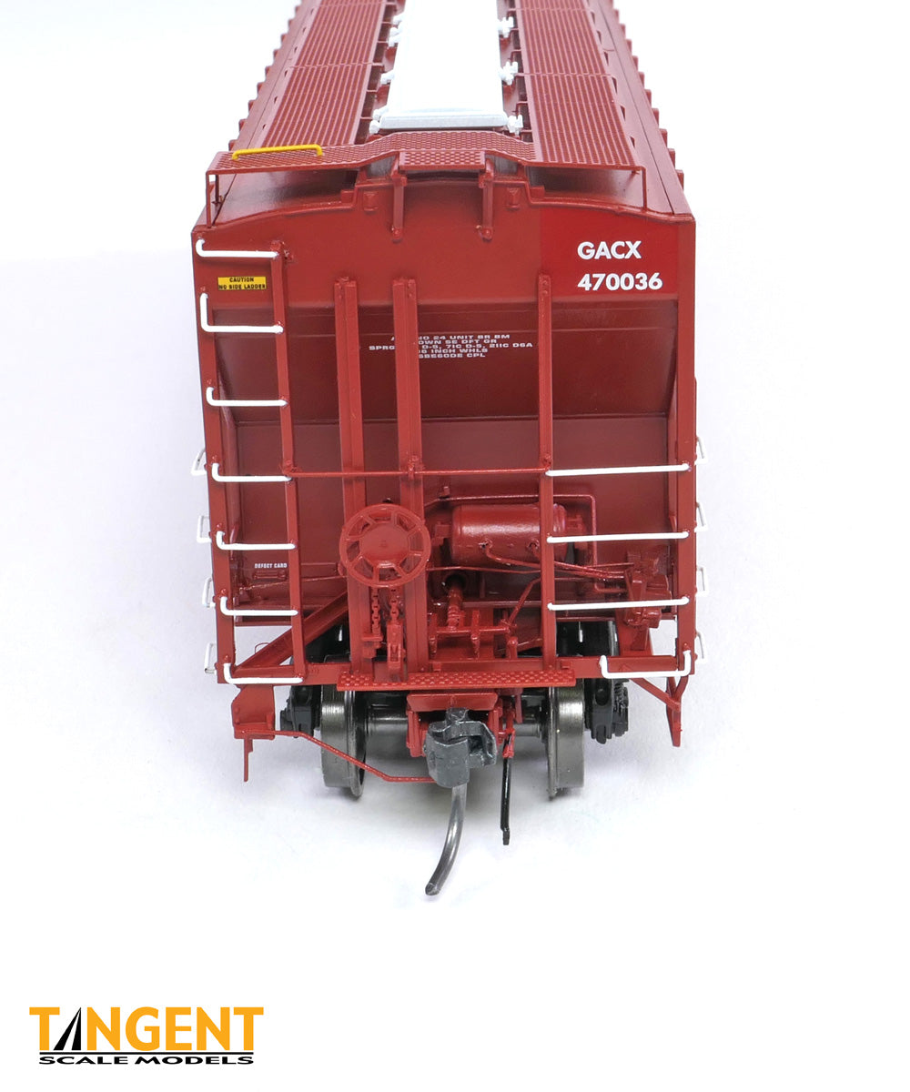 – GACX “BNSF Patch 2010” is one of two BN/BNSF patch-out offerings in this run of Trinity 4750s, and are in general lease service.  These cars are former BNSF swoosh cars that were patched out.  These models are interesting because they mimic GATX’s patching of the BNSF reporting marks and logos, however they retain most of the other data.  We offer a muted carbody color and a fresh paint patch out.  We also mimic GATX’s treatment of the grab irons, where they painted the grab irons on the sides and ends of the car white in a nod to rail employee safety.  These cars are formerly BN cars built in 1994.  These cars have a Phase 4 body and bolster arrangement, including the jacking pad design that is less long horizontally, and with an oval-shaped attachment hole in the center.  Additionally, these cars introduce the “bolt on” outlet gate design that was found on some of the Trinity 4750 prototypes.  Up on the roof of the cars is a carbody red painted galvanized “slope up” Morton-design running board, and the fiberglass trough hatches that BNSF applied are replicated on our model.  The ends of the cars include a body-mount brake system, Universal 9300DC brake housing, tube-style defect card holders, and straight-handle coupler lift bars, all of which are accurately modeled on our Tangent replicas.  Underneath the cars, the centersill dividers have access holes in them like they should, and a “angled style” AEI tag mount.  Don’t miss out on these or on our GACX “BN Patch 2010 cars – they go together!