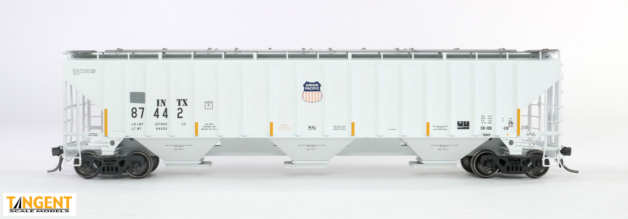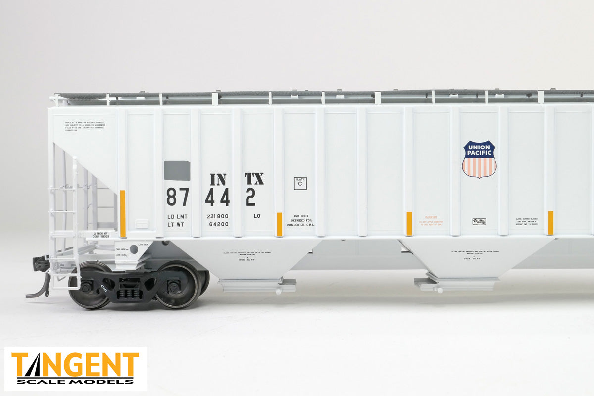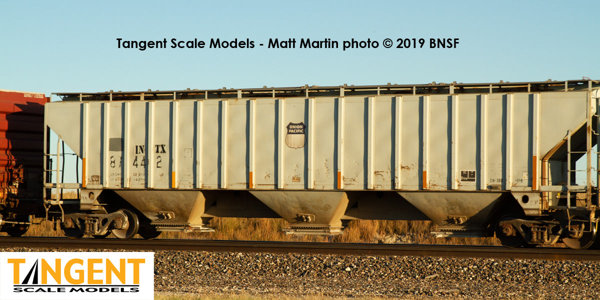 – INTX “UP Patch 2013” are formerly UP system cars that were leased to INTX, which stands for Interstate Commodities Inc., a railcar leasing firm that has bought up many cars including these Trinity 4750s. The cars retain their UP paint jobs, but to match prototype weathering patterns we have faded the body color like to represent the chalking paint of the prototypes, and we have included a faded Union Pacific shield in the center of the car (well, three out of the 4 car numbers have them – one has a patched out shield per prototype practice). We also have added the conspicuity stripe patterns that are found on the real cars. We call these cars “Version 4” Trinity Pullman-Design 4750s, and they continue with the Trinity variations found on earlier prototypes, notably the changeover in jacking pad design to one that is less long horizontally, and with an oval-shaped attachment hole in the center. These Trinity 4750s include the “bolt on” outlet gate design that was found on some of the Trinity 4750 prototypes, however they do not include shaker brackets on the outlet bays! Up on the roof of the cars you will find unpainted galvanized “slope up” US Morton-design running boards which also include end supports, and the galvanized steel trough hatches that Trinity applied are replicated on our model. Every railroad had different hatches, and UP is no exception. The ends of the cars include a truck-brake system design, Universal 9300 brake housing, tube-style defect card holder, and straight-handle coupler lift bars, all of which are accurately modeled on our Tangent replicas. Underneath the cars, the centersill dividers have access holes in them like they should. On the side of the cars, the UP requested AEI tag that was angled downward remains on the carbody. All 4 cars have slight variations in their patch outs.