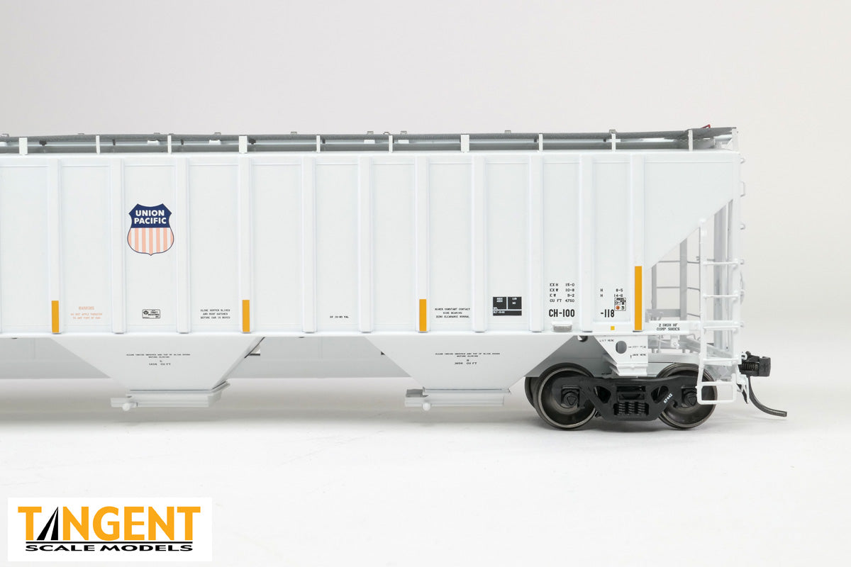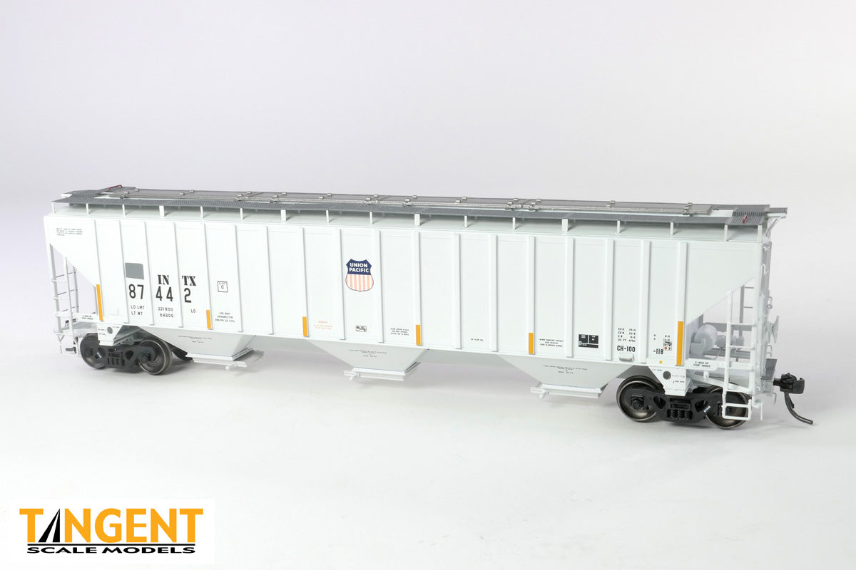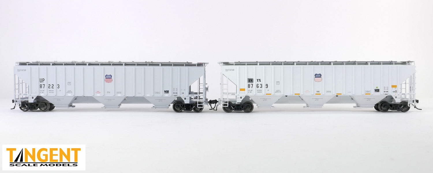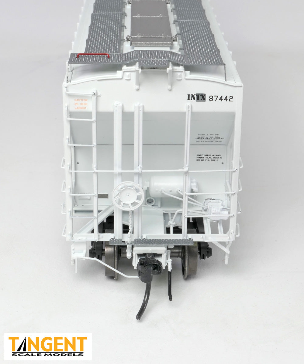 – INTX “UP Patch 2013” are formerly UP system cars that were leased to INTX, which stands for Interstate Commodities Inc., a railcar leasing firm that has bought up many cars including these Trinity 4750s. The cars retain their UP paint jobs, but to match prototype weathering patterns we have faded the body color like to represent the chalking paint of the prototypes, and we have included a faded Union Pacific shield in the center of the car (well, three out of the 4 car numbers have them – one has a patched out shield per prototype practice). We also have added the conspicuity stripe patterns that are found on the real cars. We call these cars “Version 4” Trinity Pullman-Design 4750s, and they continue with the Trinity variations found on earlier prototypes, notably the changeover in jacking pad design to one that is less long horizontally, and with an oval-shaped attachment hole in the center. These Trinity 4750s include the “bolt on” outlet gate design that was found on some of the Trinity 4750 prototypes, however they do not include shaker brackets on the outlet bays! Up on the roof of the cars you will find unpainted galvanized “slope up” US Morton-design running boards which also include end supports, and the galvanized steel trough hatches that Trinity applied are replicated on our model. Every railroad had different hatches, and UP is no exception. The ends of the cars include a truck-brake system design, Universal 9300 brake housing, tube-style defect card holder, and straight-handle coupler lift bars, all of which are accurately modeled on our Tangent replicas. Underneath the cars, the centersill dividers have access holes in them like they should. On the side of the cars, the UP requested AEI tag that was angled downward remains on the carbody. All 4 cars have slight variations in their patch outs.