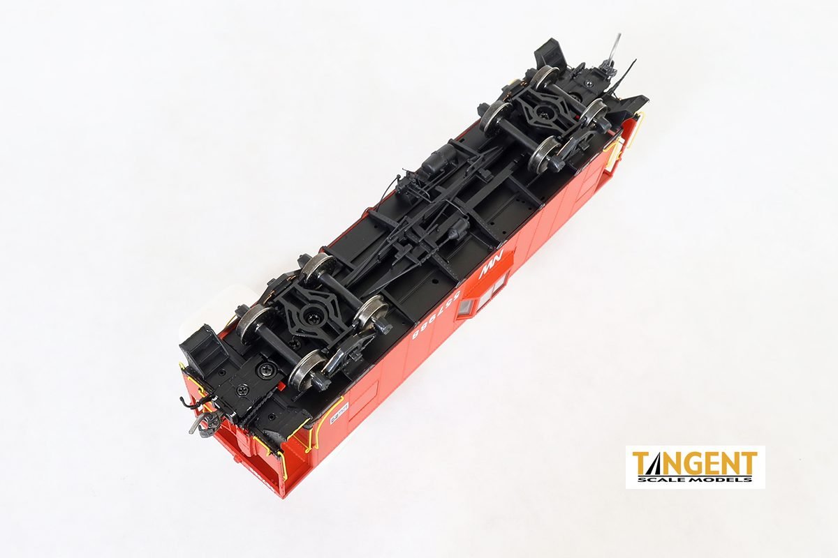 Norfolk & Western (NW) “Red Repaint 1982+” is the final paint scheme to be applied to the ITC St. Louis Car Co. caboose fleet. The NW took over operations of the ITC in 1981 and refurbished several of the ITC cabooses in 1982 for local and transfer service. It is amazing what a fresh coat of caboose red and white NW graphics can do! The prototype side windows have been plated over, and the rooftop walkways and end ladders are long gone. This model features these same modernizations, and make sure that you check out the intricate roof walkway metal brackets. You can see the individual walkway bolt holes on top of each one! These are the finest walkway brackets available in HO Scale. The ends of the caboose feature era-appropriate flashing FRA red lights. The underframe has also lost the equipment boxes and toilet pipe. The interior of the caboose is lit, which can still be seen through those big bay windows. We kept getting asked from the NW guys about this scheme, so now’s your chance to have a little bit of the 1980s in your caboose fleet.