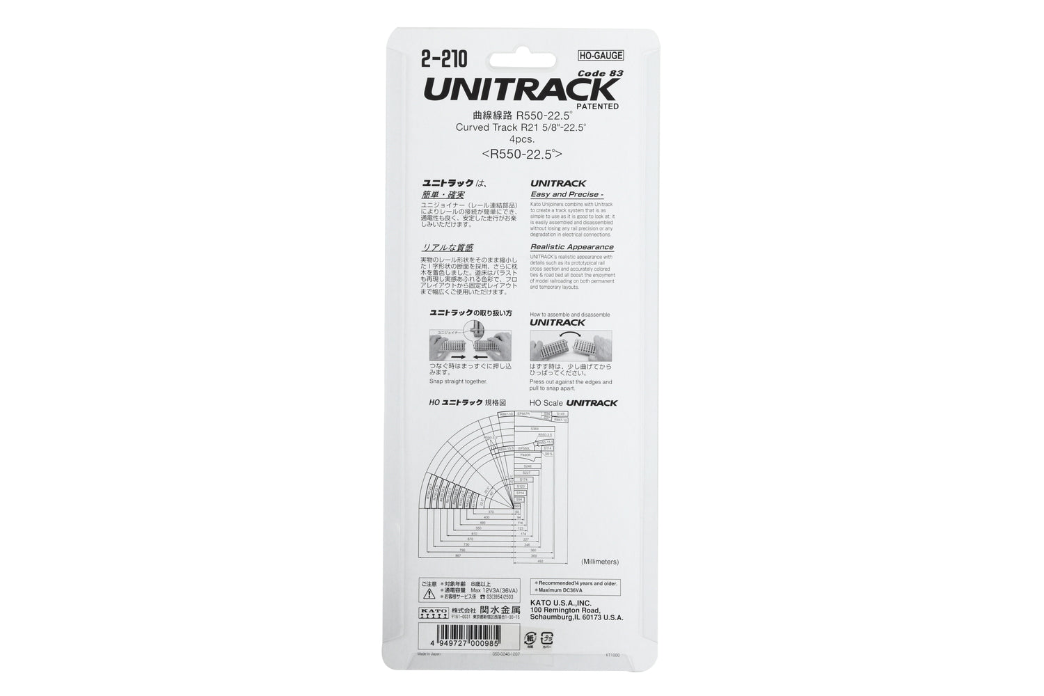 Kato HO Scale Unitrack R550-22.5 Curve Track 4 Pack 2210