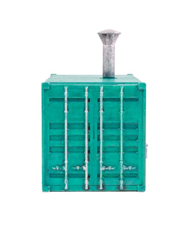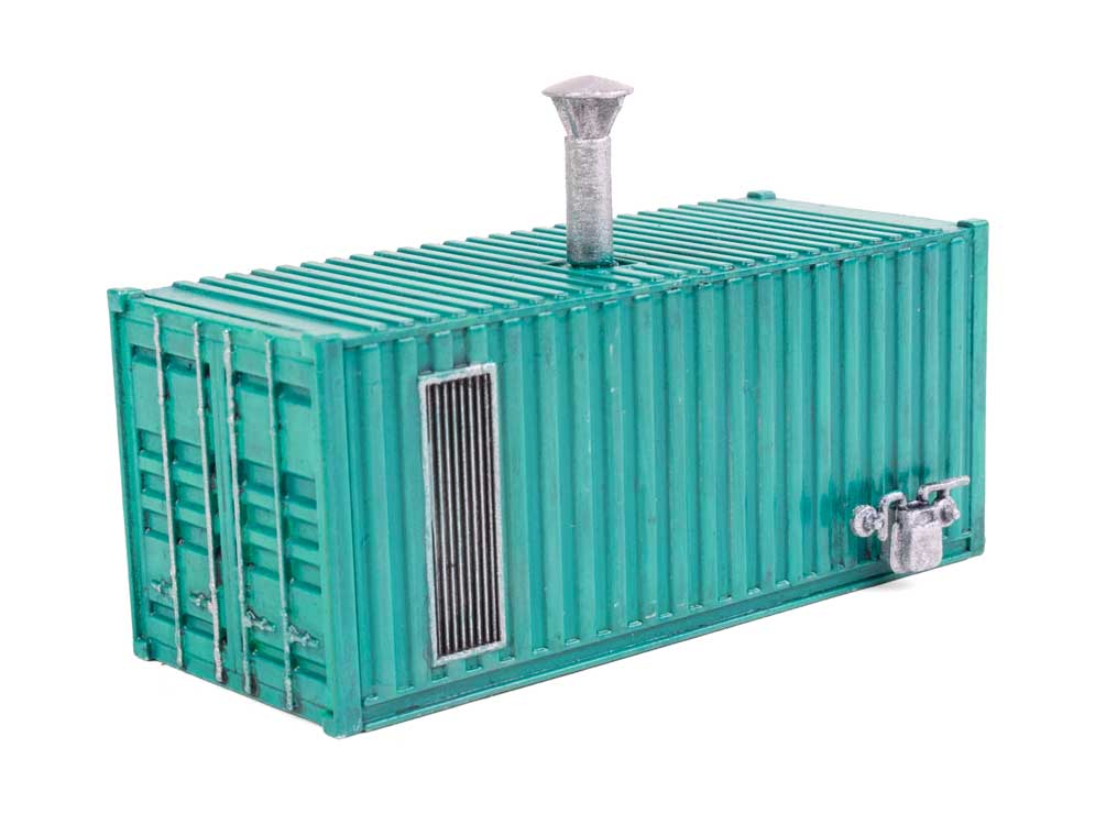 This structure started life as a shipping container and now serves as a boiler house to provide auxiliary steam and heat for transload facilities or other industrial sites. The utilitarian design is common and fits well into any modern scene.