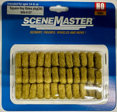 A quick and easy detail for your HO layout, the SceneMaster Square Hay Bales are perfect for barn, fields, or as a load for trucks, boxcars and the Large Farm Trailer (#949-4193), each sold separately. This set comes with 36 flocked bales, ready to add to new or existing scenes. Each measures 3/16 x 5/16 x 7/16" .5 x .8 x 1.2cm.