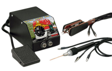 Footswitch permits hands-free activation of power, vastly improving control while soldering and virtually eliminating the sparking that is common with other brands of resistance based systems.