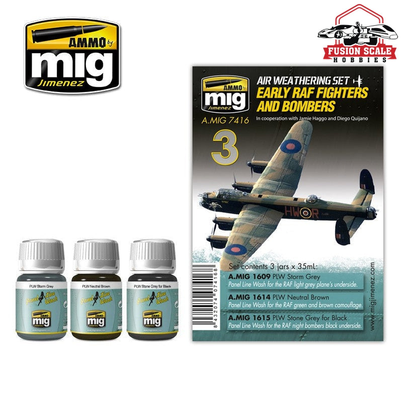 Set for washes and defining panel lines of RAF fighters and bombers during World War II. Includes 3 colors from Panel Line Wash line, allowing us to easily outline these aircraft:A.MIG-1609 PLW Storm Grey, perfect for grey bluish use in lower areas.A.MIG-1614 PLW Neutral Brown, to panel Brown and Green colors of upper areas.A.MIG-1615 PLW Stone Grey for Black, for green color.