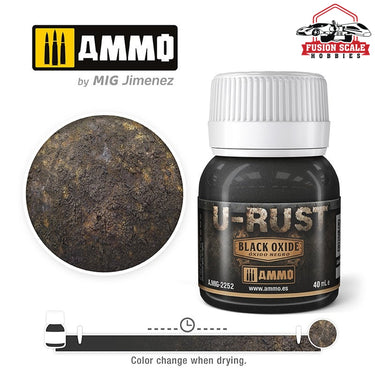 Product formulated to create real black oxide. Ideal for simulating dark oxidation zones and fantasy scenarios. Provided in a convenient 40 ml (1.35 fl oz) container. Compatible with the entire U-Rust range.