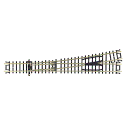 Custom N Line Switches are made to be used with the Atlas Under-Table Switch Machine (item #65) or a ground throw. Unlike the other N scale switches which have shortened ties to allow for switch machine attachment, Custom N Line switches have full-length ties. A double-ended throwbar allows you to place your undertable switch machine on either side of the switch. Comes with one piece of 19″ radius track.