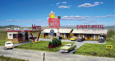 Pull in for a good night's rest at this charming roadside motel. First appearing in the 1950s alongside busy US highways, many are still in use today.The main office is done up in a streamline moderne style and comes with canopy and rooftop Motel sign, laser-etched sidewalks and curb, plus optional flagstone wainscot. Two four-unit motel units are provided, which feature tab and slot scribed walls, roof and floor. Peel-n-stick doors, windows, gable vents, trim and laser-cut printed 3-tab roofing are all included. Decorative porch posts and laser etched sidewalks, plus a rooftop "Sunset Motel" sign provide the finishing touches. Parts are included to build a spectacular laser-cut sign for the front, a soda machine, and additional full-color signs (taken from photos of actual hotels) are included to customize your structure.Finished model measures: Office w/Canopy: 2-5/8 x 1-13/16"6.6 x 4.5cm Each Motel Unit: 3-1/2 x 1-1/2" 8.8 x 3.8cm