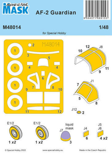 Pre-cut painting masks designed for the clear parts and undercarriage wheels of the AF-2 Guardian bomber model kits SH48135, SH48158, SH48194 a SH48225.