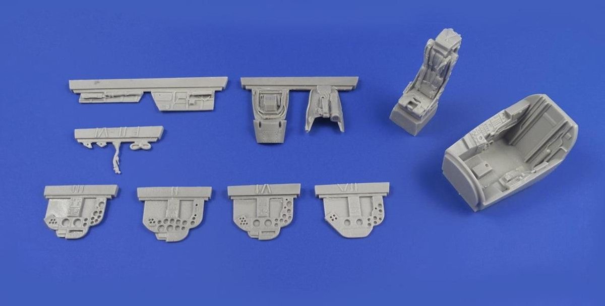 Highly detailed cockpit resin parts for F2/F2A/F3/F6 versions of the BAC Lightning jet. The set comes with all new cockpit tub, side walls, ejection seat, control column and neatly detailed instrument panels which capture the differences between the versions. The instrument gauges are printed on a piece of clear film. For Airfix / Eduard kits.