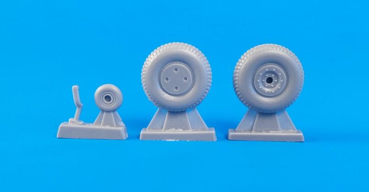 The set contains entirely new undercarriage wheels with detailed square-type tread pattern that was used during operations from unpaved airfields. There is also a new tail wheel with its strut.
