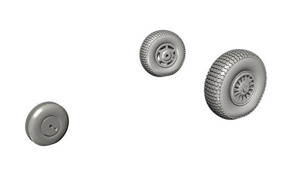 The set consits of a nose wheel and mainwheels with the later style hubs. These wheels are designed to fit single seat Vampire models from Special Hobby and Extratech or two-seater training Vampires from Aifix. The nosewheel comes as a one piece while the kit items have to be assembled from two parts. The mainwheel tyres feature nicely rendered and accurate tread pattern. The master parts were 3D created.
