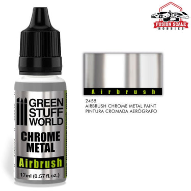 Chrome Paint Alcohol-based metallic paint to achieve an effect that imitates the metallic reflection of a chrome surface similar to a mirror. Designed to be used with an airbrush, always apply on glossy surfaces, preferably black or very dark. A matte base will not allow mirror-like reflections, and light colors will reduce the desired effect. The mirror effect could be reduced or even lost if inks or varnishes are added on top. After applying and once completely dry, in case the surface does not completely mirror, rub with something soft (brush, sponge, ear swab, cloth ...) to polish and highlight the mirror effect.Contains 17ml